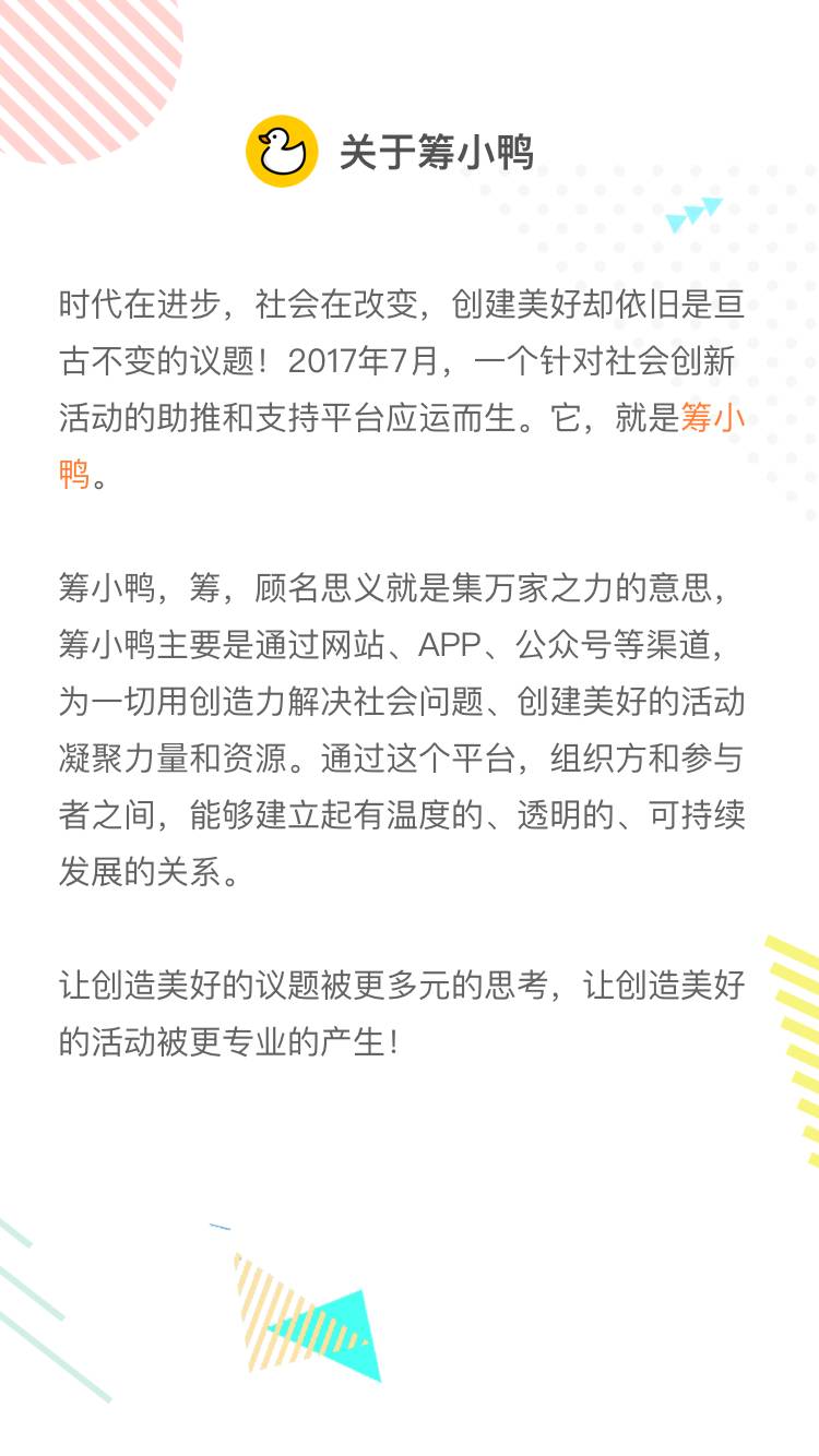 筹⼩鸭(杭州)科技有限公司成⽴于2017年7⽉,致⼒于服务中⼩型公益组织,打造中国最⼤公益平台。筹⼩鸭以公众号、WEB、APP为载体,整合公益活动,为公益组织提供活动宣发、推⼴、筹集资 ⾦等⼀站式服务。在筹⼩鸭平台上,公益组织申请发起者资质,平台进⾏审核,通过审核后发起者可在线上发起公益活动。平台根据活动的内容和⽬标⽤户,匹配相符的媒体、场地、企业赞助等资源为公益组织提供服务;同时也为媒体提供优质内容、为场地提供流量、为赞助商提供线上及线下多种形式的推⼴和宣传。
