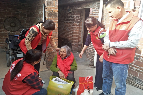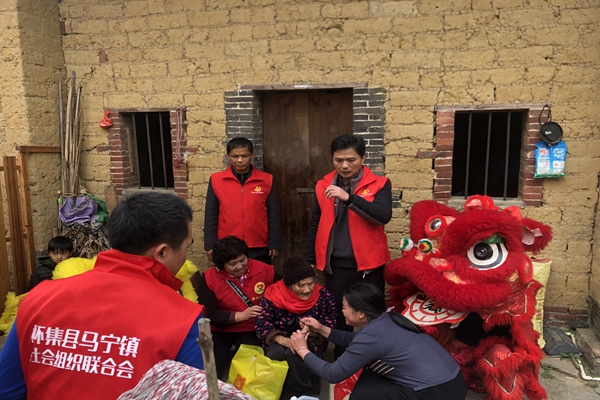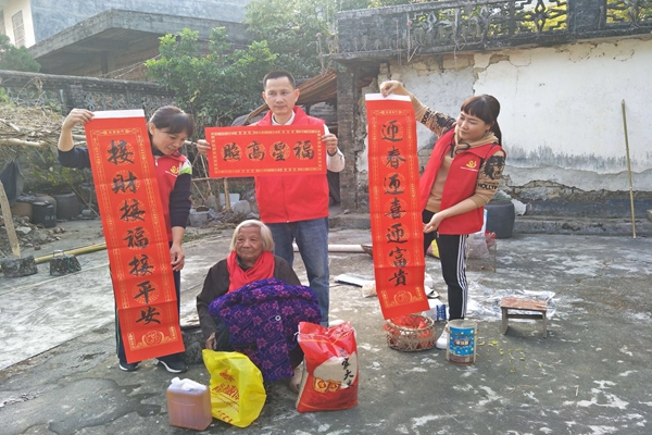 揭牌仪式结束后,与会嘉宾身肩志愿者职责,以实际的行动诠释联合会“扶贫济困”的创会宗旨,深入省定贫困村——富礼村进行元旦送暖,深切慰问当地的26名85岁以上的长者。活动中,志愿者们为每一位受访长者送上大米、花生油、保暖衣、“中国红”围巾等家常礼物,同时携醒狮送祝福,为老人们送上祝福春联。“开门迎春春满院,抬头见喜喜事多”“和顺满门添百福,平安二字值千金”,一幅幅春联满载新年的祝福和希望。