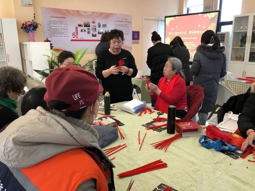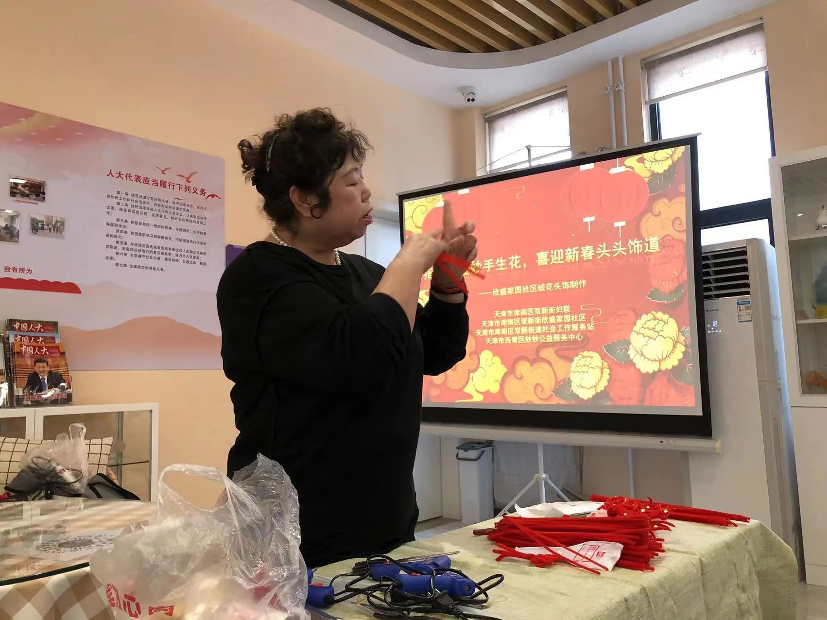 临近春节,为促进社区基金来源多元化,拓宽就业渠道,激发社会组织孵化中心能工巧匠们的创业热情和创收潜能,西青区赤龙南街道社工站带领手工坊文创工坊组刘阿姨,走进津南区双新街欣盛家园社区,为爱好手工艺品的居民们带来非遗红绒花发饰的精彩手工。