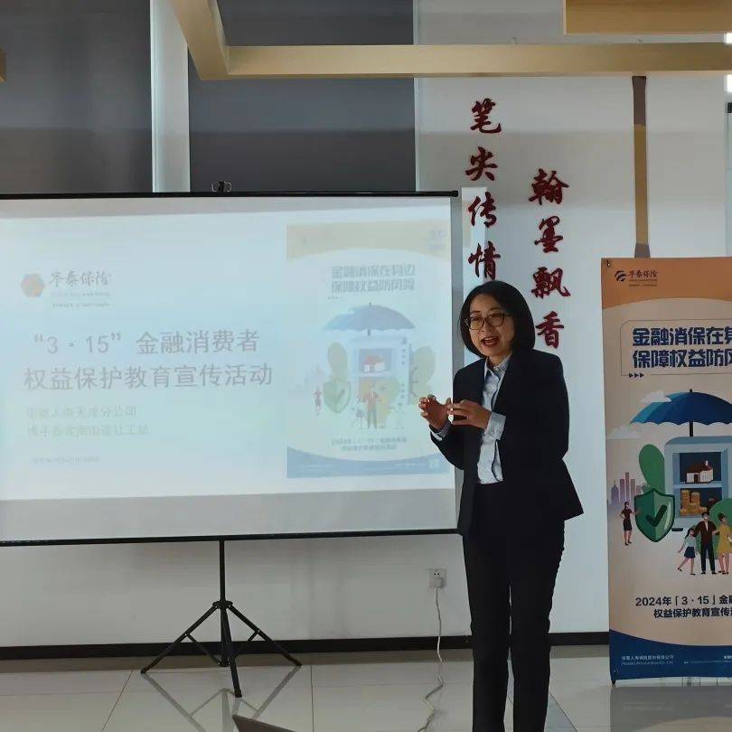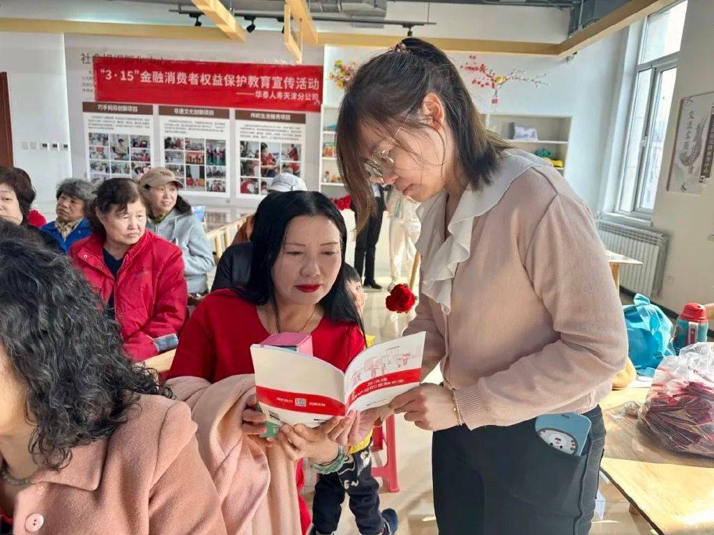 活动现场,社工为社区居民发放宣传彩页,华泰人寿天津分公司运营部冯经理为现场居民讲解消费者权益保护基本知识,普及账户安全,信息安全,保险保障等安全知识。
