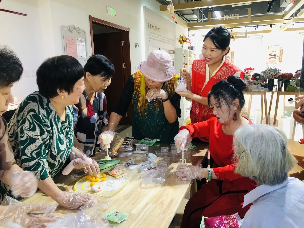 猜灯谜,一场记忆与速度的较量,“海上生明月,天涯共此时”、“但愿人长久,千里共婵娟”以及有趣的物品猜谜“肚里空空,水放当中,谁要用它,都得鞠躬”等十几个灯谜与诗词,猜对谜底的居民喜悦之情溢于言表,没抢答到的也铆足劲再接再厉,文化诗词与节日气氛热闹非凡。DIY冰皮月饼,志愿者与独居老人们结对成组,模具压制月饼的时刻传递着乐趣与幸福。