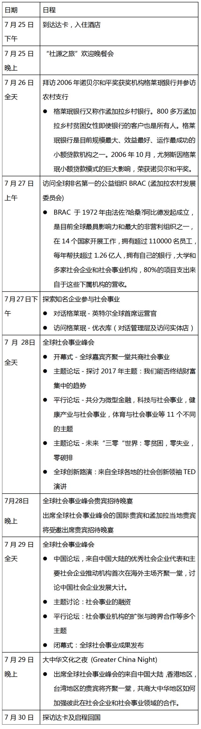 社源之旅为期六天(2017年7月25日-2017年7月30日 地点:孟加拉首都达卡)深度参访世界著名的小额贷款发祥地格莱珉银行;拜访全球排名第一的公益组织BRAC;对话全球顶尖社会事业格莱珉-英特尔和格莱珉-优衣库的高管团队;全程参与知名的全球社会事业峰会;参与中国社会企业界的首个海外主场活动—中国论坛。