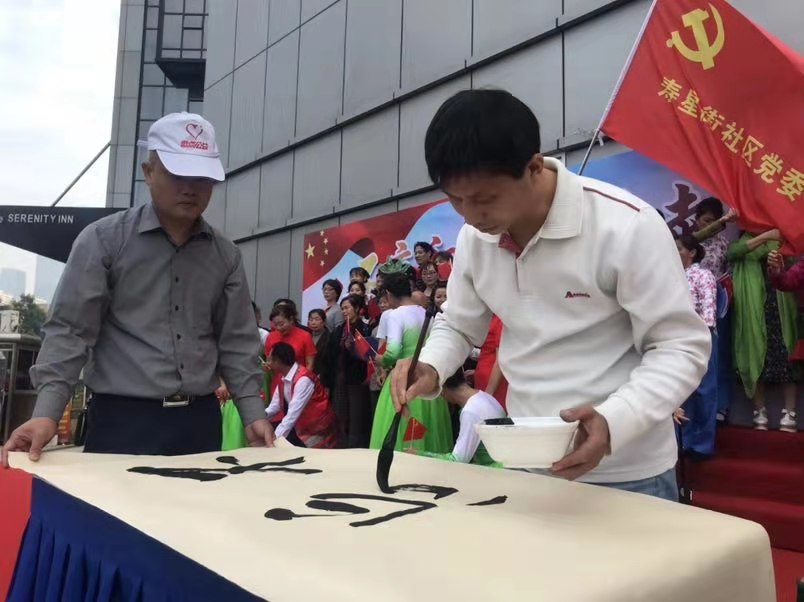最后的环节以主持人熊老师带来的独唱《我爱你中国》开始,用歌声赞美我们的祖国,紧接着由著名湘剧艺术家伍仁斌老师给大家带来了一段花鼓戏《你待同志亲如一家》,这段花鼓戏源自于《沙家浜》第二段”军民渔水情“。活动的最后是合唱本次汇演的最后一首歌曲《我和我的祖国》并邀请书法家傅献忠老师在台上现场书写本次活动的主题。音乐响起,在场的所有观众都一起挥舞着手中的五星红旗,一起合唱,本次汇演推向了最高潮,也为本次的汇演画上了完美的句号。