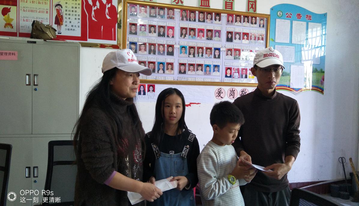我们在麦市镇中心小学见到了去年资助的周佳怡和周锦安,两个小家伙已经到镇中心小学上学,是六年级的学生了,微点公益的志愿者将今年的爱心款发放到两位同学手中,并嘱咐他们好好学习。