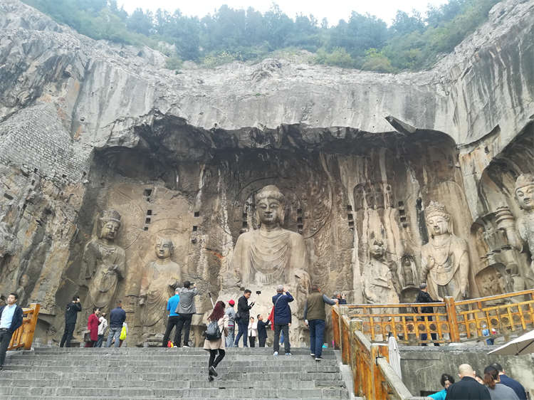 快乐之旅的第一站是龙门石窟。龙门石窟依伊河而建,始于北魏,成于宋代,历经400多年的大规模的营造,南北长达1公里,山上的石壁上共凿有窟龛2000多个,大大小小的佛像10万余尊,其神态各异,栩栩如生。在这些佛像中,尤以奉先寺中的卢舍那大佛最为著名,堪称龙门石窟的名片。龙门石窟从不同侧面反映了我国古代政治、经济、宗教、文化等领域的发展变化,不愧为世界文化的遗产。