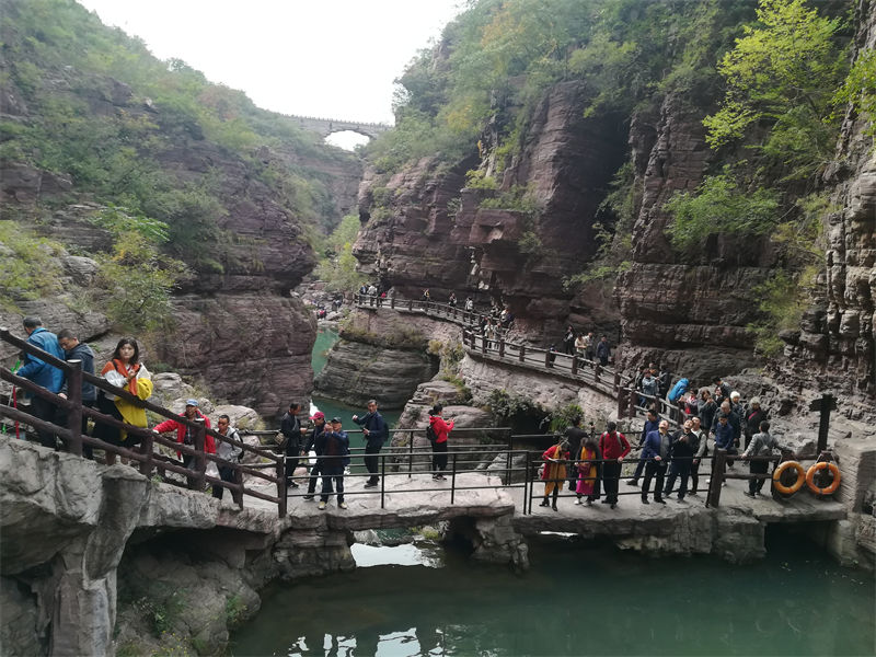 我们游览的第三站是被誉为“中原山水画廊”的云台山。云台山以千姿百态的飞瀑流泉而著称,以奇峰秀岭而称奇。行走在溪谷中,两岸奇峰叠峙,上山原始植被茂密,雄奇壮美;曲曲折折的溪水流淌在高低突兀的山石中,或成溪布、或成涓涓细流、或成湍湍激流,激流倾泻跌落而下,汇成千姿百态的瀑布,其色悦目,其音悦耳,让人心旷神怡。