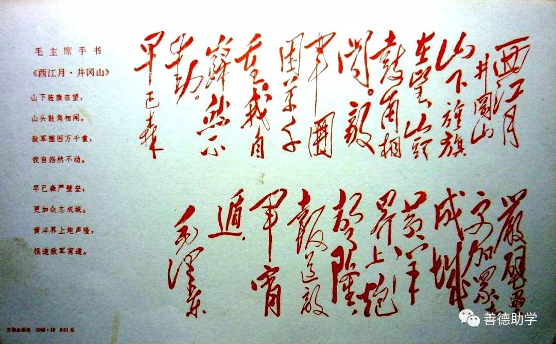 井冈山被誉为“中国革命的摇篮”和“中华人民共和国的奠基石”,毛泽东同志曾为他写下《西江月·井冈山》和《水调歌头·重上井冈山》等诗词。井冈山的斗争,为中国开辟了一条成功之路,尤其为后人留下宝贵的精神财富——井冈山精神:坚定信念,敢闯新路。