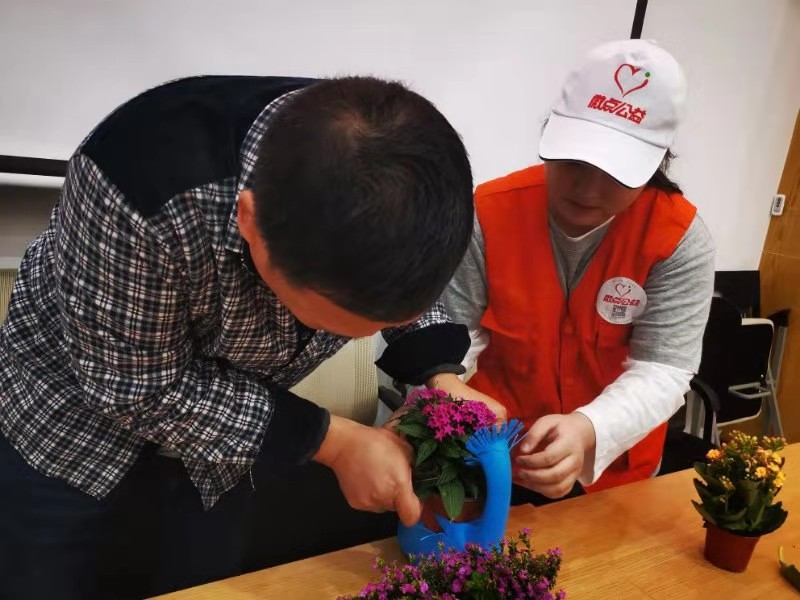 爱护祖国我们还可以从身边的小事做起,例如日常生活中的垃圾分类,我们可以废物利用,用身边的可回收物品装饰我们的生活,让我们的家园更加美丽美好。本次活动的最后一个环节,微点公益的社工教大家利用废弃的洗衣液瓶来做花盆。在场的所有人都做得很认真,发挥自己的想象做出了形态各异的花盆。到场的所有居民都对本次活动十分满意。