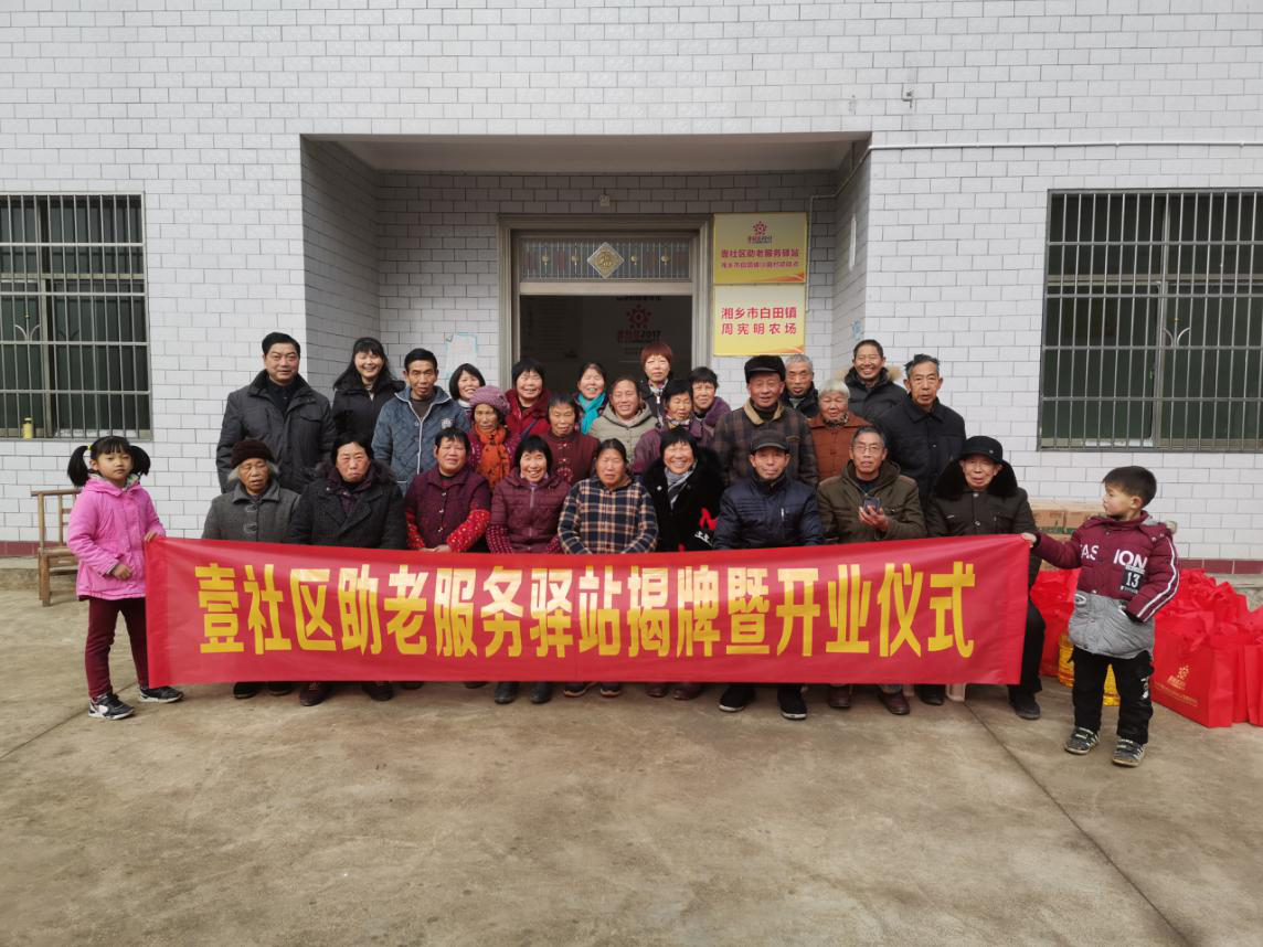 2020年元月12日,在这个阳光明媚的三九天里,壹社区助老服务驿站揭牌仪式在湘乡市白田镇沙田村隆重举行。沙田村书记杨润生、村主任皮亮娥、长沙市壹社区社会组织公益服务中心理事长周辉以及10多名沙田村的热心志愿者和50多位老年人代表齐聚现场,共同见证了助老服务驿站揭牌仪式。