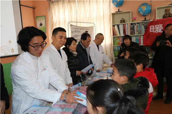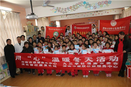 2019年12月25日下午,渭南市慈慧康养中心,渭南市脊柱康复医院,九三学社渭南市委会,渭南市脊柱康复医院慈善者服务队,渭南市益欣公益服务中心一行人来到临渭区思远小学开展此次暖冬行动——用“心”温暖冬天关爱留守儿童,为397名留守儿童捐赠了总价值约5000元的学习用品。