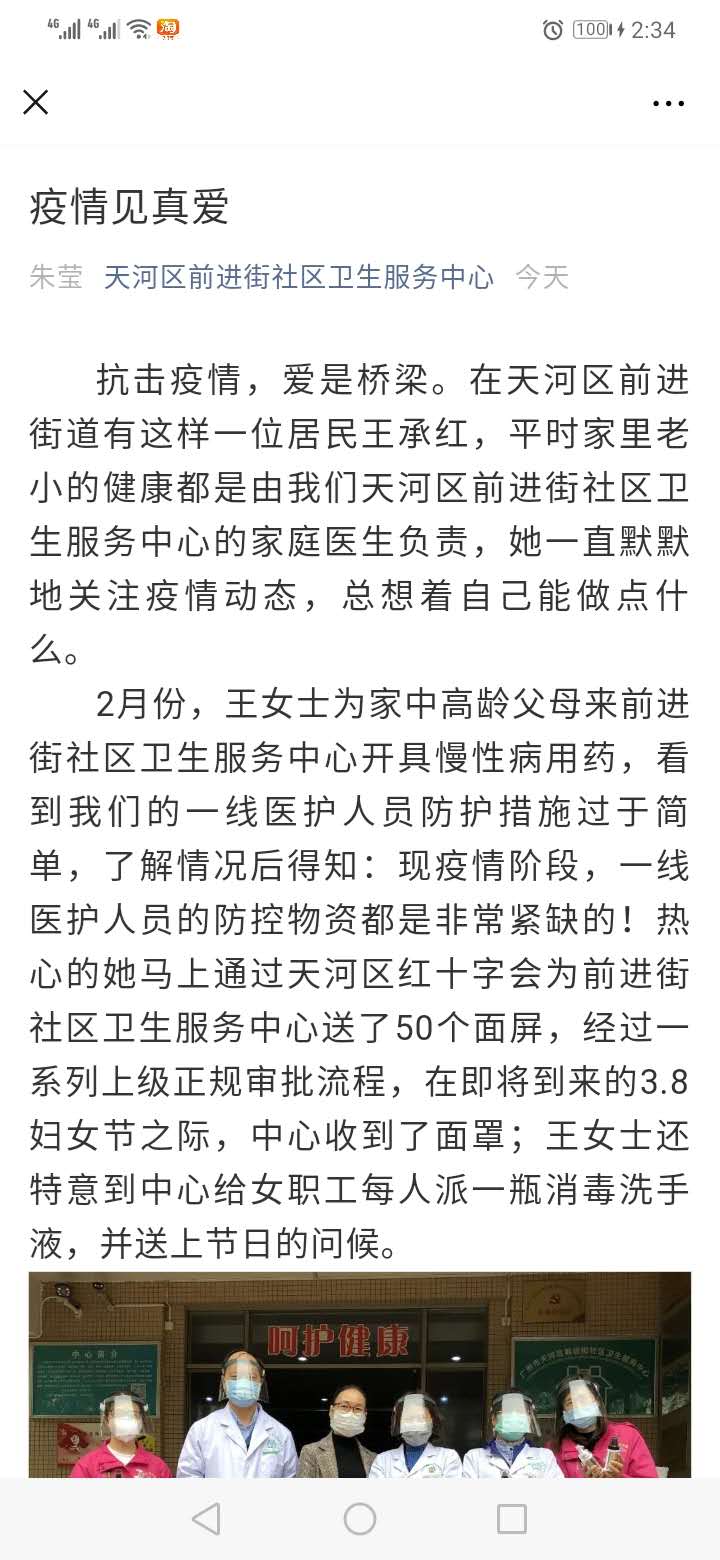 近日,天河区前进街社区卫生服务中心举行简单的捐赠仪式,善德助学会副会长王承红通过天河区红十字会为前进街社区卫生服务中心送了50个面屏(防护面罩)。在即将到来的3.8妇女节之际,王会长还特意为每位中心女职工送上消毒洗手液,并送上节日的问候。另外,王承红副会长已向天河区慈善会捐赠200件防护面罩,用于支持天河区新型冠状病毒肺炎疫情防控工作。