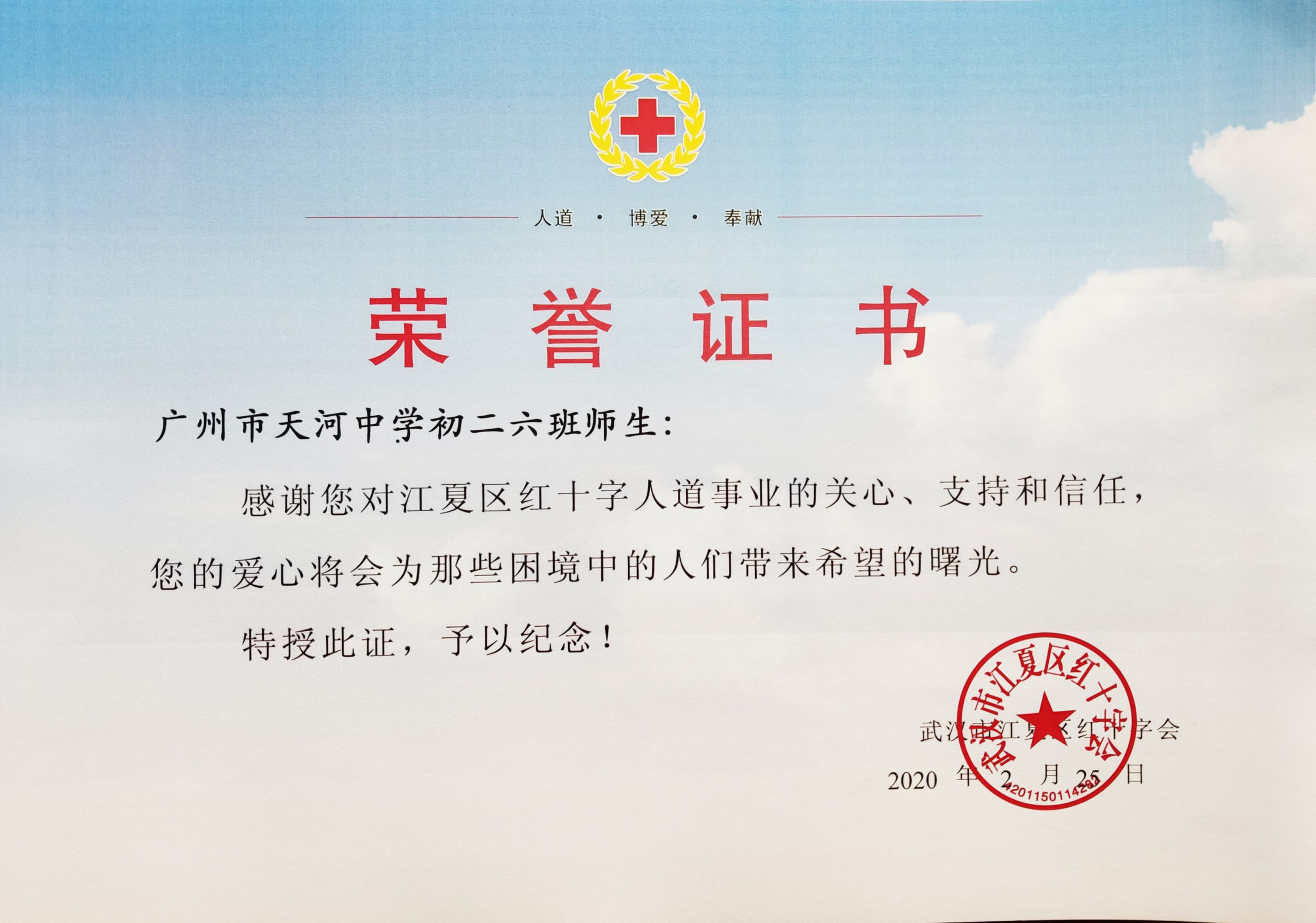 王承红副会长还充分发挥社会力量,与孩子所在的班级家委会沟通,发动天河中学初二六班师生一起奉献爱心。活动共筹集善款17610元购买了2840个N95折叠防护口罩寄至武汉江夏区红十字会,由对方定向用于武汉江夏区第一人民医院抵抗疫情使用。