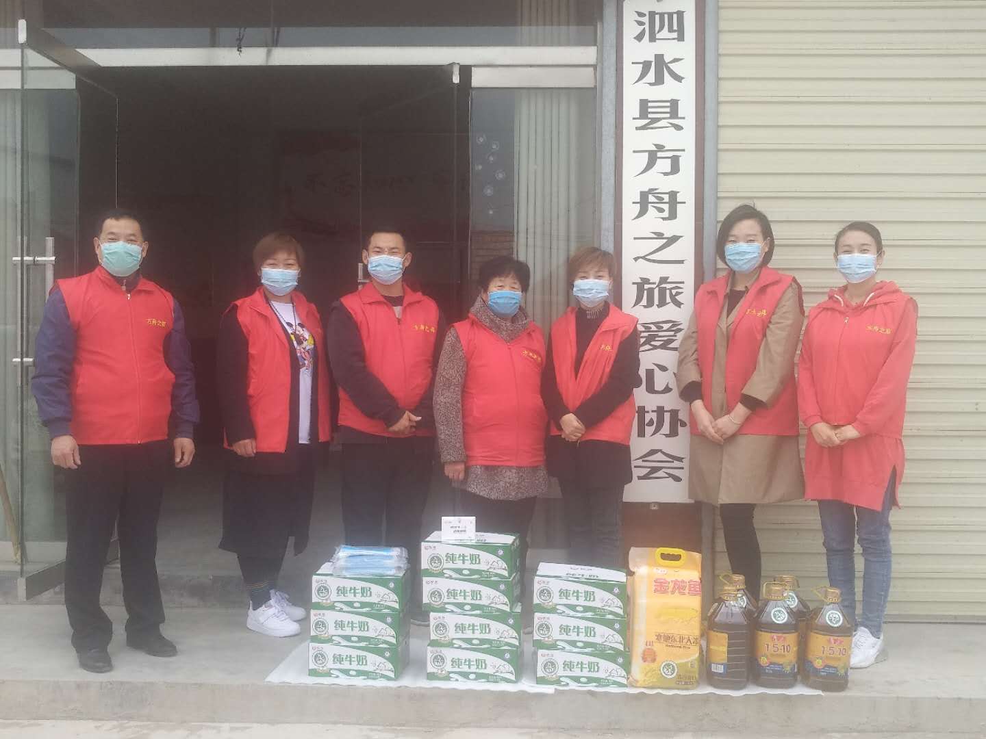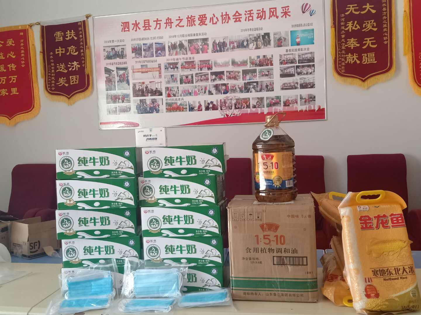 3月6日,民政部办公厅印发《关于在疫情防控期间加强特殊困难老年人关爱服务的通知》后,泗水县方舟之旅爱心协会积极响应政府号召,在第一时间参加中国社会福利基金会发起的“暖心工程·温暖抗疫”公益项目,在一星期的时间里共募集资金1241元,筹集到5个“防疫暖心生活包”。每个生活包装有口罩10个、免洗手医用酒精凝胶1瓶、食用油5L、牛奶2箱、大米10斤。