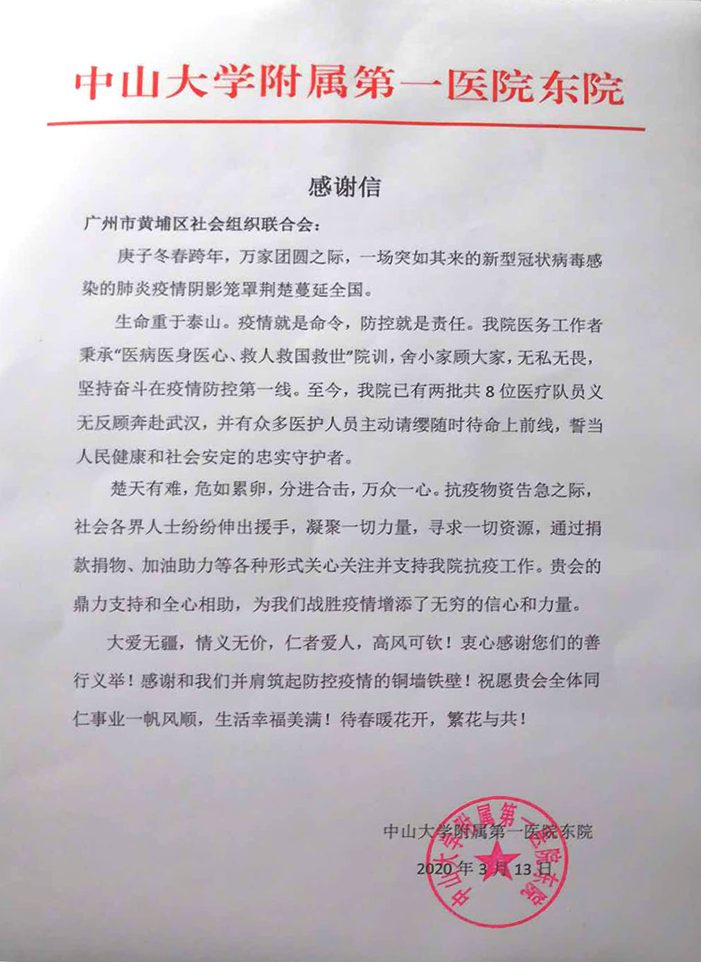 3月13日下午,“疫情无情 黄埔有爱”捐赠仪式在中山大学附属第一医院东院(以下简称东院)举行。本次活动是由黄埔区社会组织联合会联合广州开发区善德助学促进会、广州市黄埔区开发区企业联合会、广州市黄埔(开发)区税务局等共同发起的“疫情无情 黄埔有爱”社会组织及爱心人士向黄埔区一线医护人员捐赠防护物资的募捐活动。活动向东院捐赠现金五万元和防护物资一批。