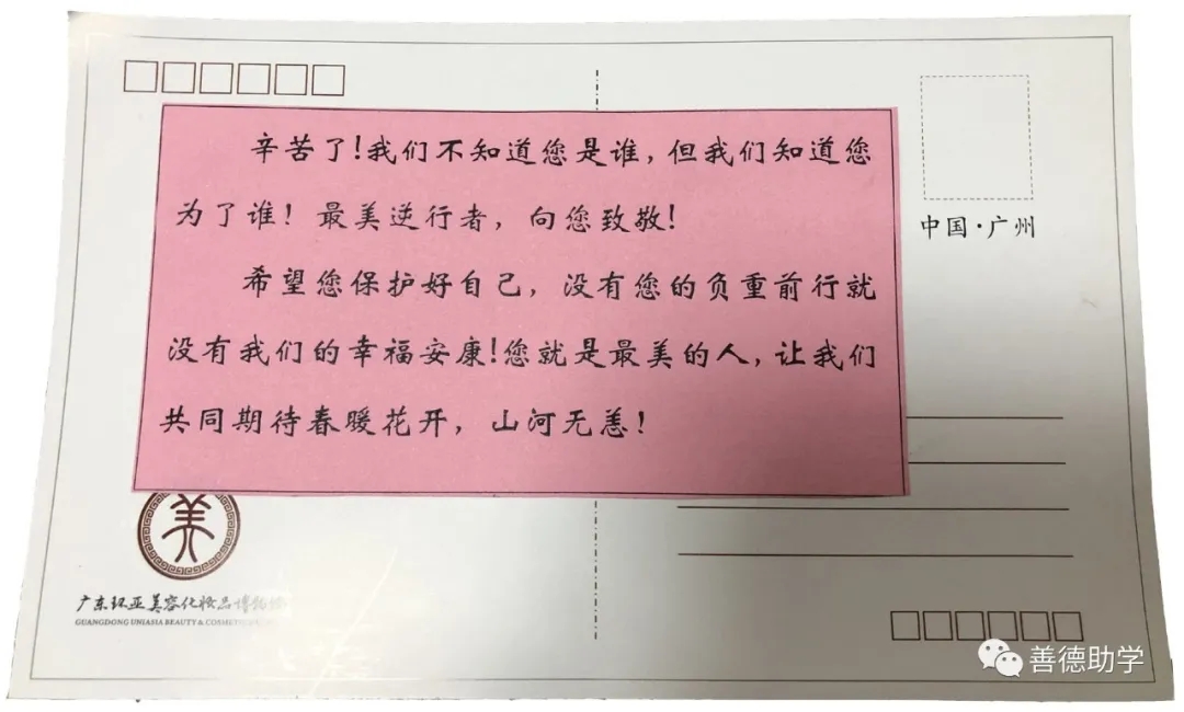 本次捐赠活动除了为抗疫防疫医务人员送上医疗防护物资外,还附上了一份暖暖的祝福。祝愿各位医务人员早日打赢这场没有硝烟的“战争”,早日和家人团聚。