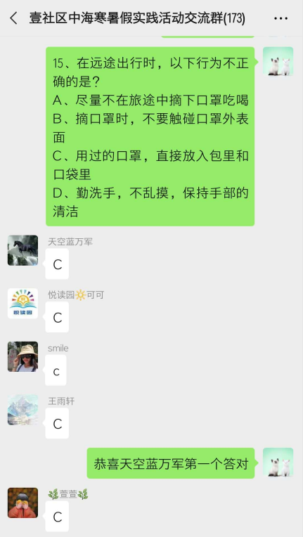 叮叮叮......,晚七点,壹社区寒暑期实践群里热闹非凡。为了调动家长及孩子的参与积极性,在活动正式开始前,壹社区社工带领群成员们玩起了线上成语猜猜猜游戏,紧张激烈的抢答, 充分调动起活动气氛。安全有序复学,从点滴开始。壹社区社工以课件为主要载体,采用短视频和文字讲解的方式,建议孩子在复学前调整作息时间、总结疫情期间的自我成长、制定学习计划、准备防疫随身包等,并要求家长与学校保持有效联系,发挥家庭教育的作用和优势。