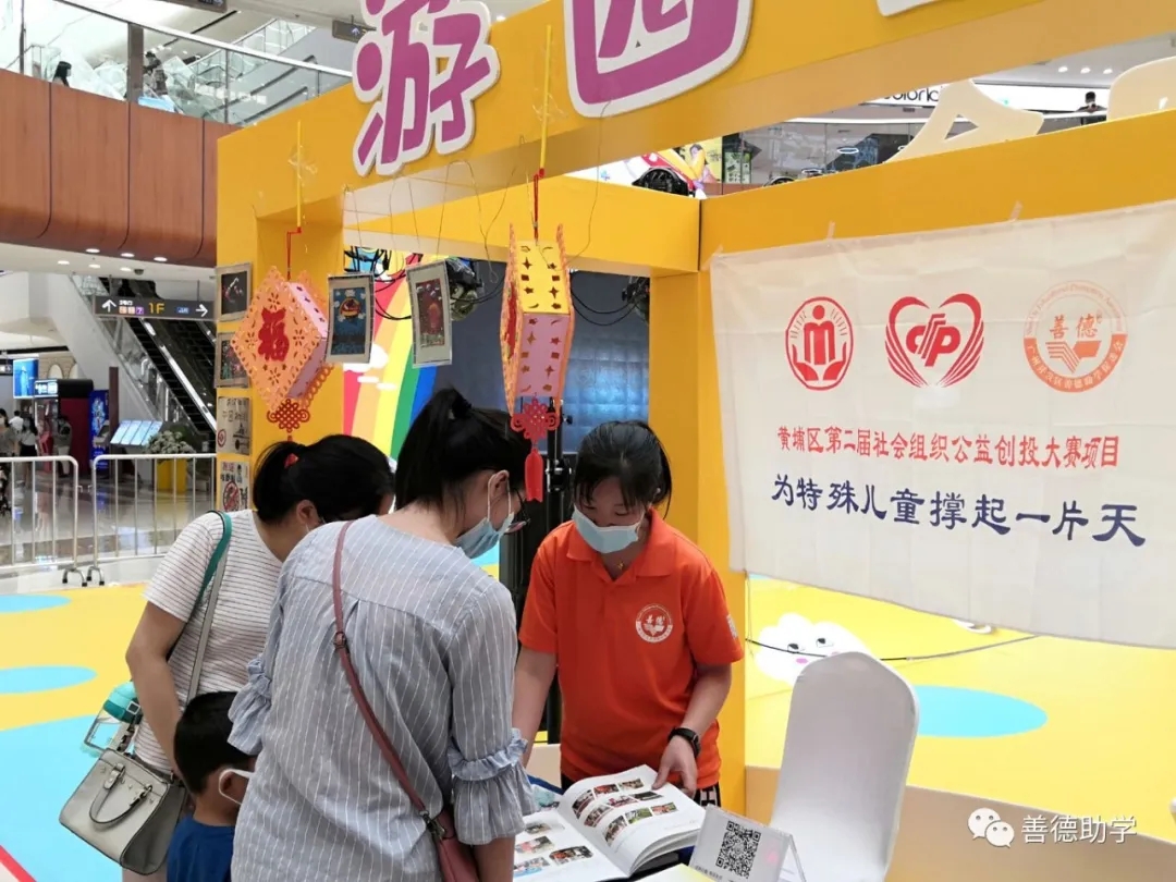 志愿者向热心人士介绍“为特殊儿童撑起一片天”公益项目