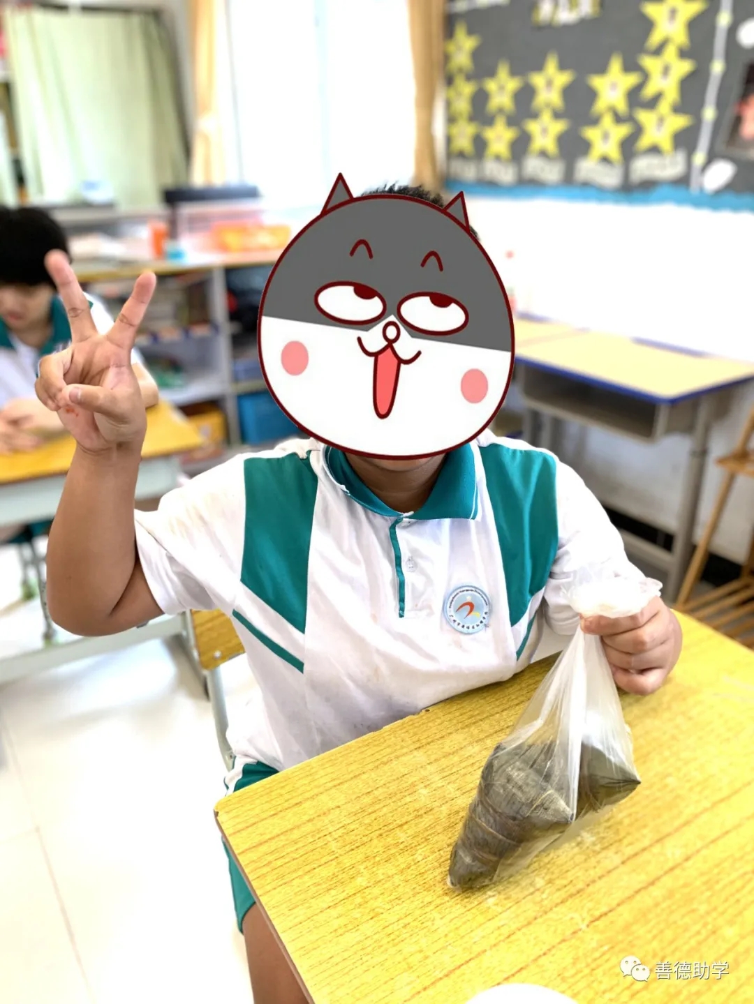 随后,老师给每位同学们分发碧绿诱人的节日礼品——粽子,课堂上随即迎来了一股扑面而来的清香和清脆无暇的欢笑声。