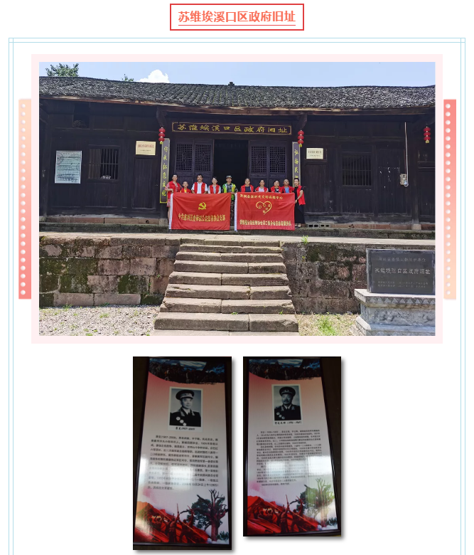 中午12点多,一行人来到慈利县溪口镇红色文化教育基地——红军树和苏维埃溪口区政府旧址学习红色文化,苏维埃溪口区政府旧址的正厅墙上挂着党旗、入党誓词和宣传展板,展板上记载着这个遗址和领军打仗的红六军团、红二方面军的简介和棉花山阻击战的整个过程,我军3000人,敌军8000人,人数差距悬殊让这场战役责任巨大,然而这并没有让我军退却,两天的激战成功的牵制了敌人,为中央红军主力长征赢得了时间。战役的惨烈、惊险和不容易,让我们每个人都明白我们的幸福生活来的多不容易,我们应该铭记历史!