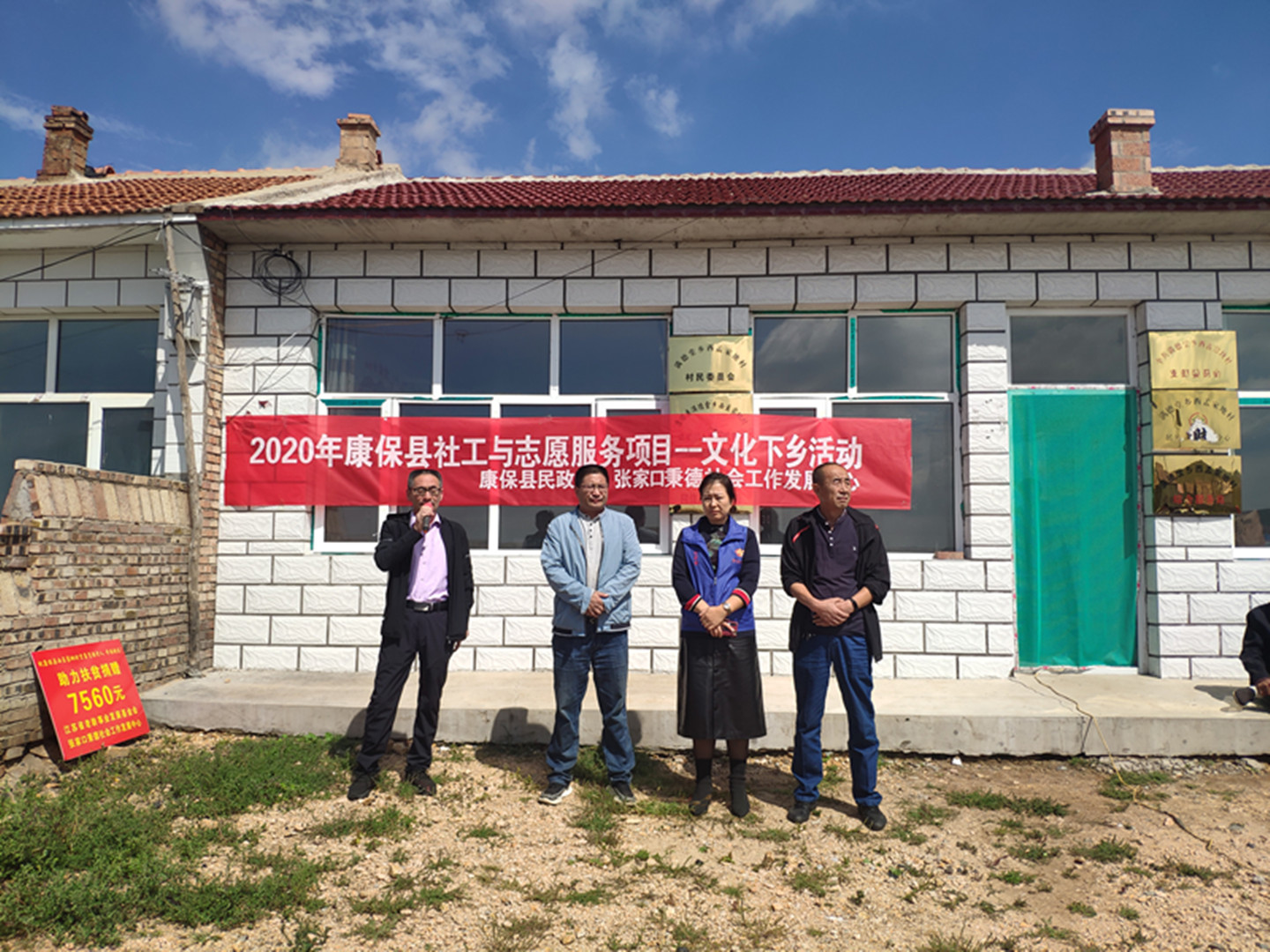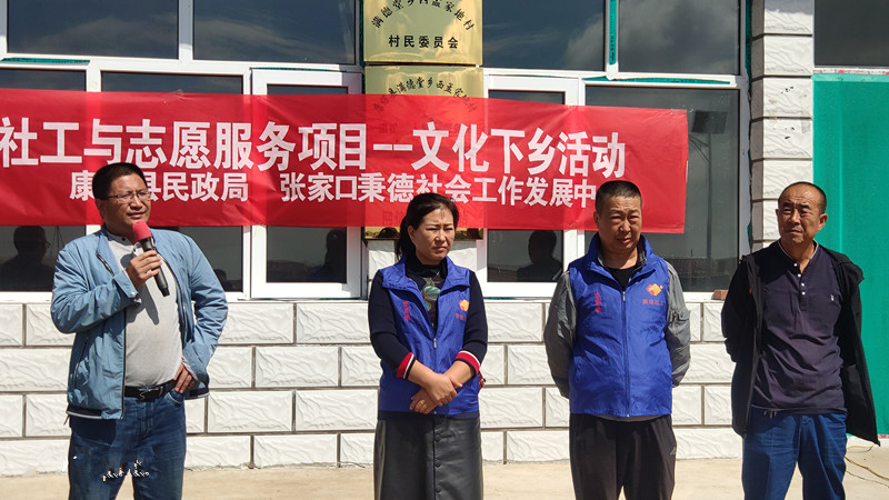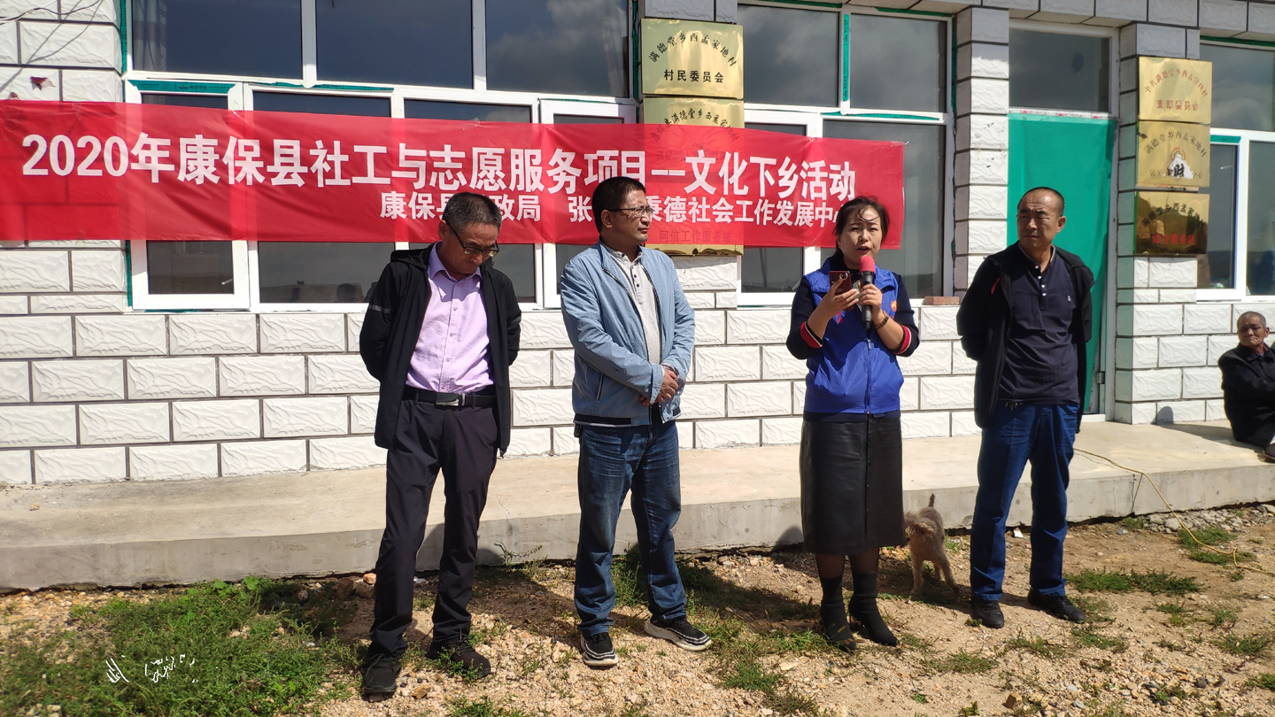8月31日清晨,张家口秉德社会工作发展中心一行6人携带慰问物资从市区出发,前往康保县满德堂乡西孟家地村开展“2020康保县社工与志愿服务项目——文化下乡暨空巢救助 益满金秋”活动。康保民政局办公室主任、驻村第一书记王天有,满德堂乡党委副书记刘文,西孟家地村书记刘红斌,秉德社工志愿者、村两委干部及村民数十人参加了此次活动。