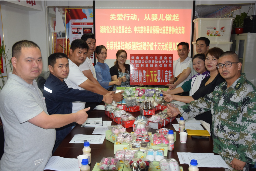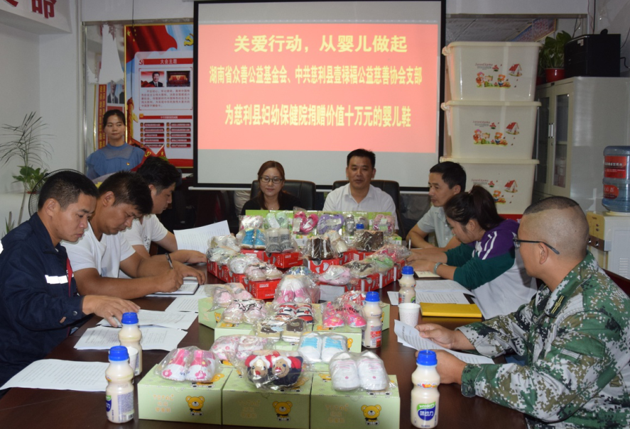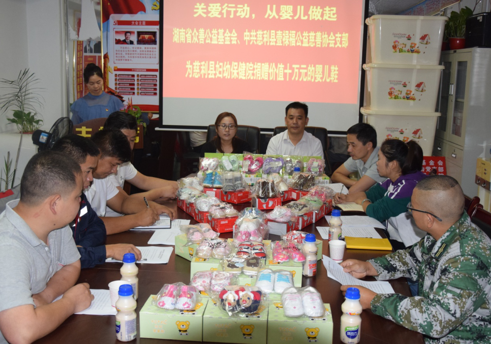 2020年9月11日,中共慈利县壹禄福公益慈善协会支部开展学习《习近平谈治国理政》,推进支部五化进程主题党日活动,携手湖南省众善公益基金会为慈利县妇幼保健院捐赠价值十万元的婴儿鞋。参加活动的有:慈利县民政局社会组织股股长杨多军、党建指导员杨姣、慈利县妇幼保健院张院长、壹禄福公益慈善协会支部党员、入党积极分子等。