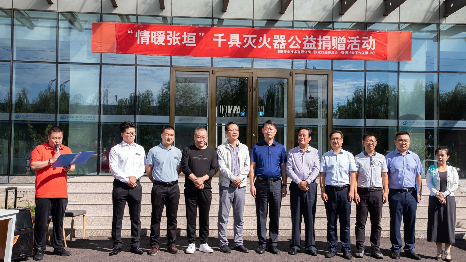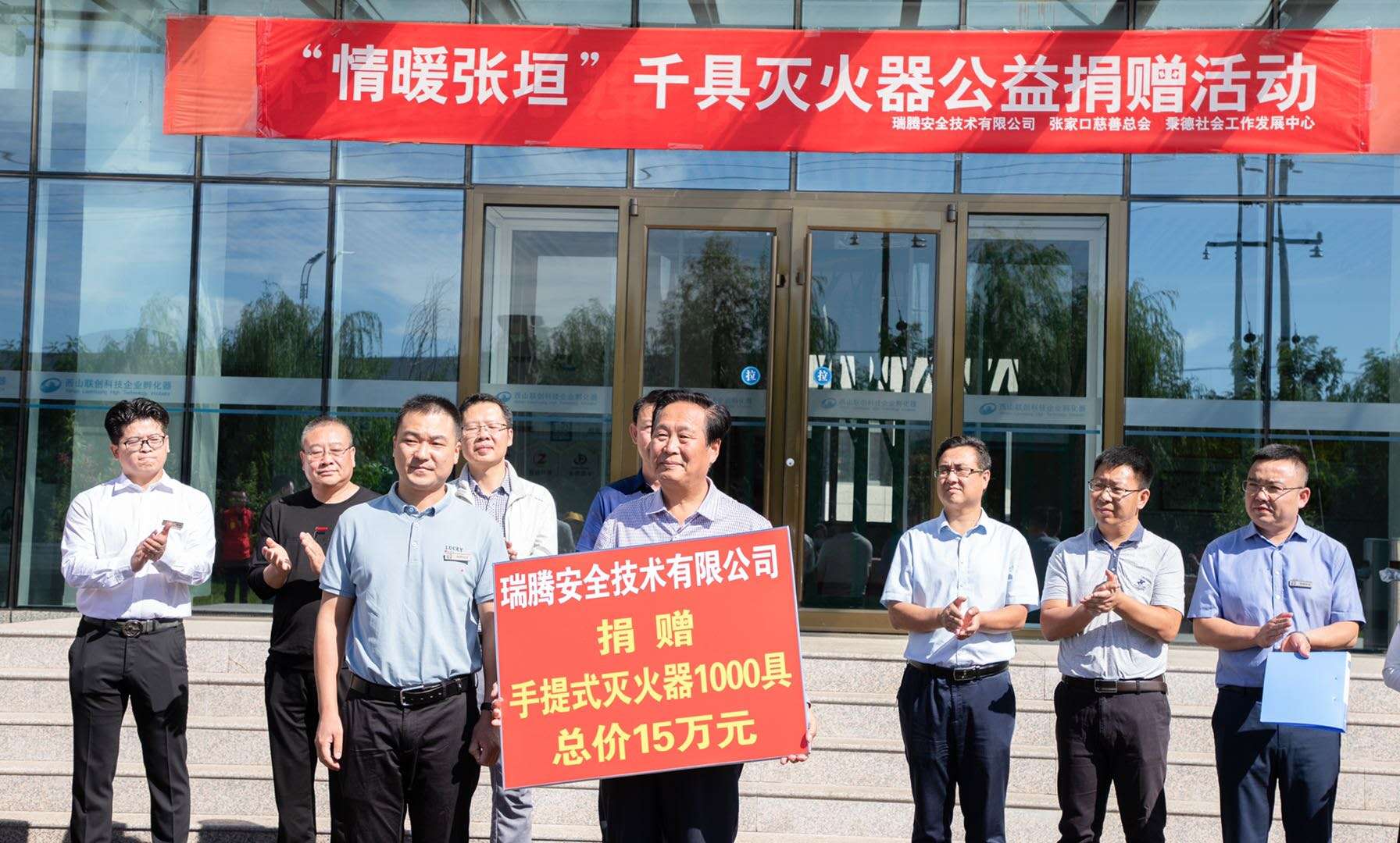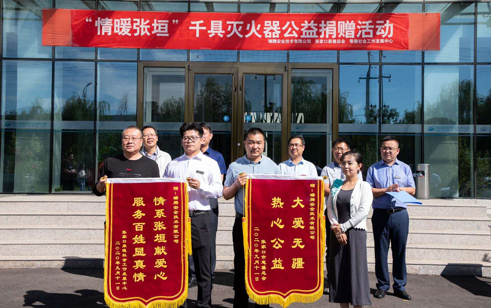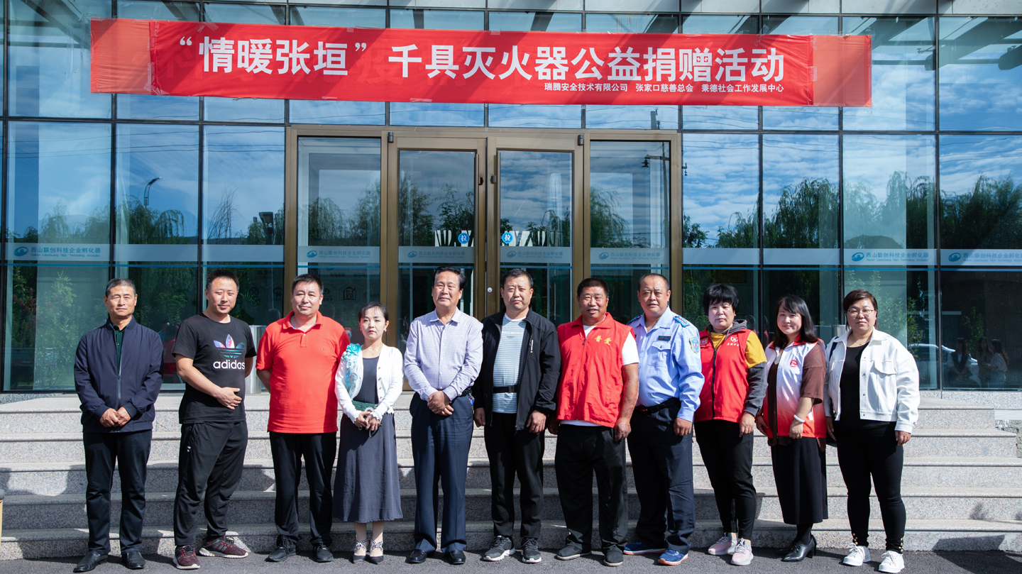 9月11日瑞腾安全技术有限公司、张家口慈善总会、秉德社会工作发展中心在张家口高新区举行“情暖张垣”千具灭火器公益捐赠活动。出席捐赠仪式的领导和嘉宾有:瑞腾安全技术有限公司主要负责人周显峰、王庆国、倪丰年,张家口市慈善总会会长李清,高新区管委会党委书记,高新区科技局局长赵俊,民进桥东区主委、张运集团旅游客运公司总经理白尚俊,张家口市社会工作联合会副秘书长涂慧雯,西山联创孵化器总经理方晓岗,张家口秉德社会工作发展中心总干事李军,以及厚德万全公益促进会、阳原县志愿服务联合会等10家公益组织负责人和志愿者出席,总干事李军主持捐赠仪式。