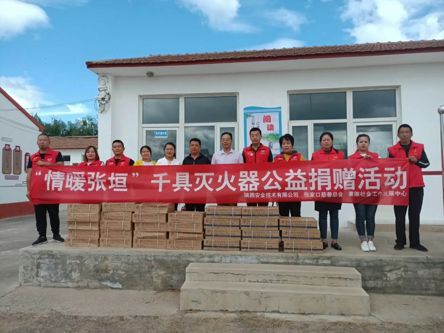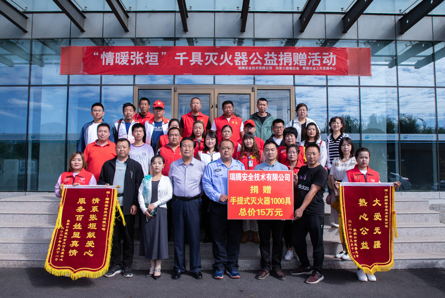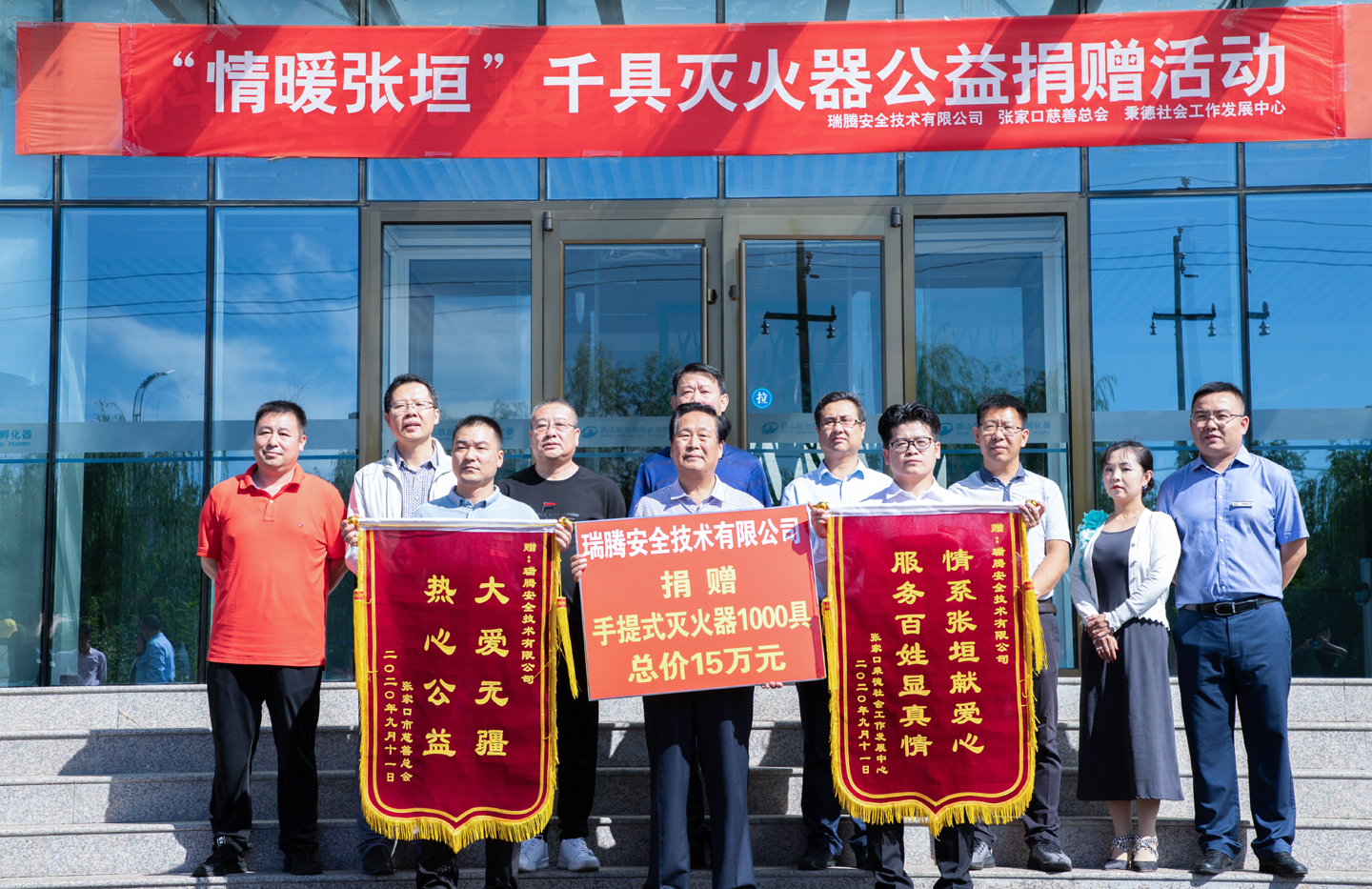 本次活动由瑞腾安全技术有限公司通过张家口市慈善总会向全市12所农村敬老院、幼儿园、寄宿制学校等机构捐赠灭火器1000具,总价15万元,本次所捐赠的物资由秉德社会工作发展中心负责分配,全市10家公益组织参与在万全、阳原、康保、怀安等10个区县进行捐赠。捐赠仪式上瑞腾安全技术有限公司和张家口慈善总会进行了现场签约,慈善总会和秉德社工等单位向瑞腾安全技术有限公司赠送了锦旗。