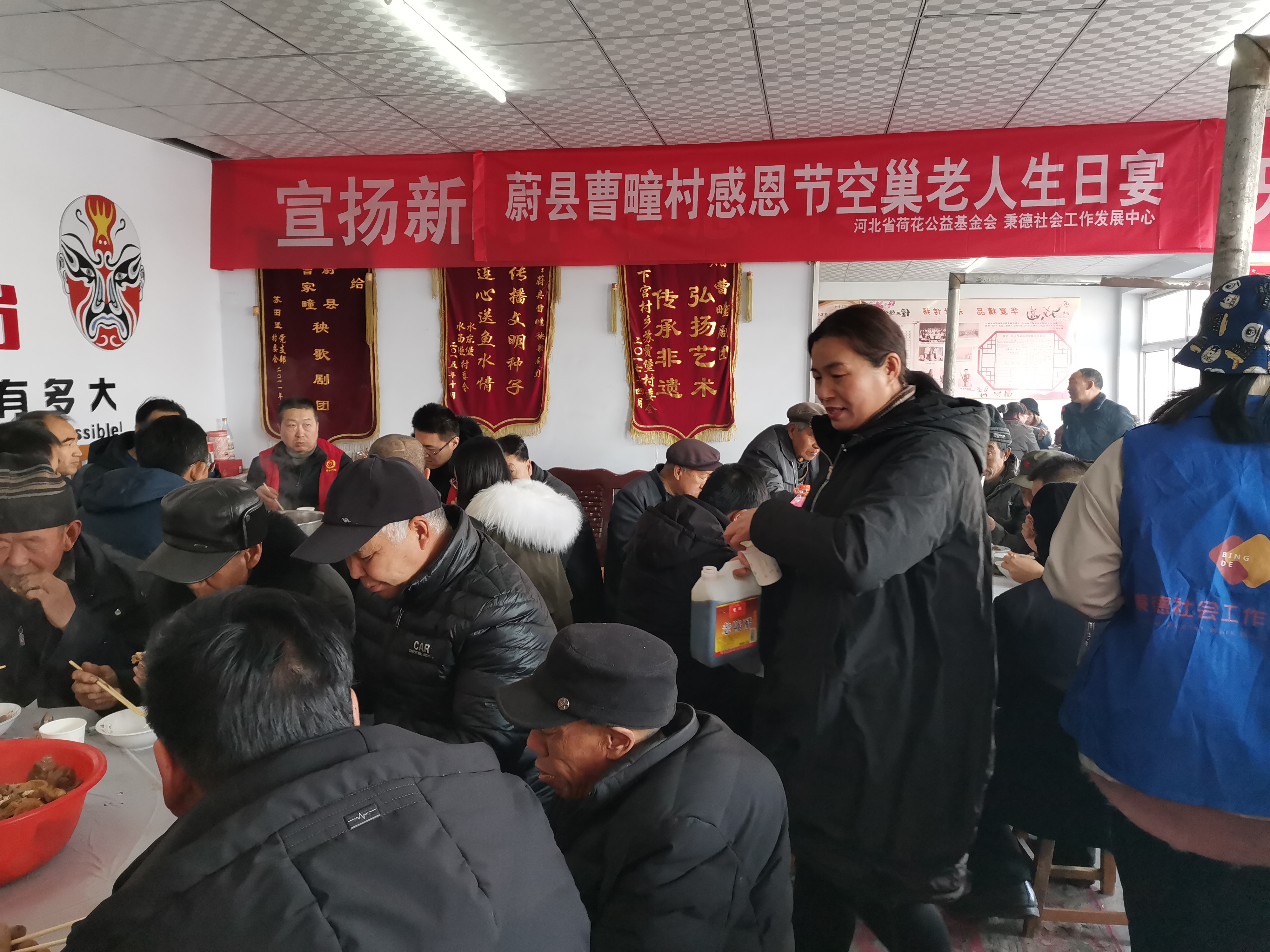 由河北省荷花公益基金会发起支持,张家口秉德社会工作发展中心承接的”妇老乡亲“农村互助养老项目9月底入驻蔚县曹疃村以来,社工志愿者认真做好前期调研工作的同时,积极开展多种形式的敬老、孝老活动。2020年11月26日,在蔚县曹疃村,由社工志愿者和村妇女志愿者共同为本村的空巢老人们举办了一场“生日宴”。