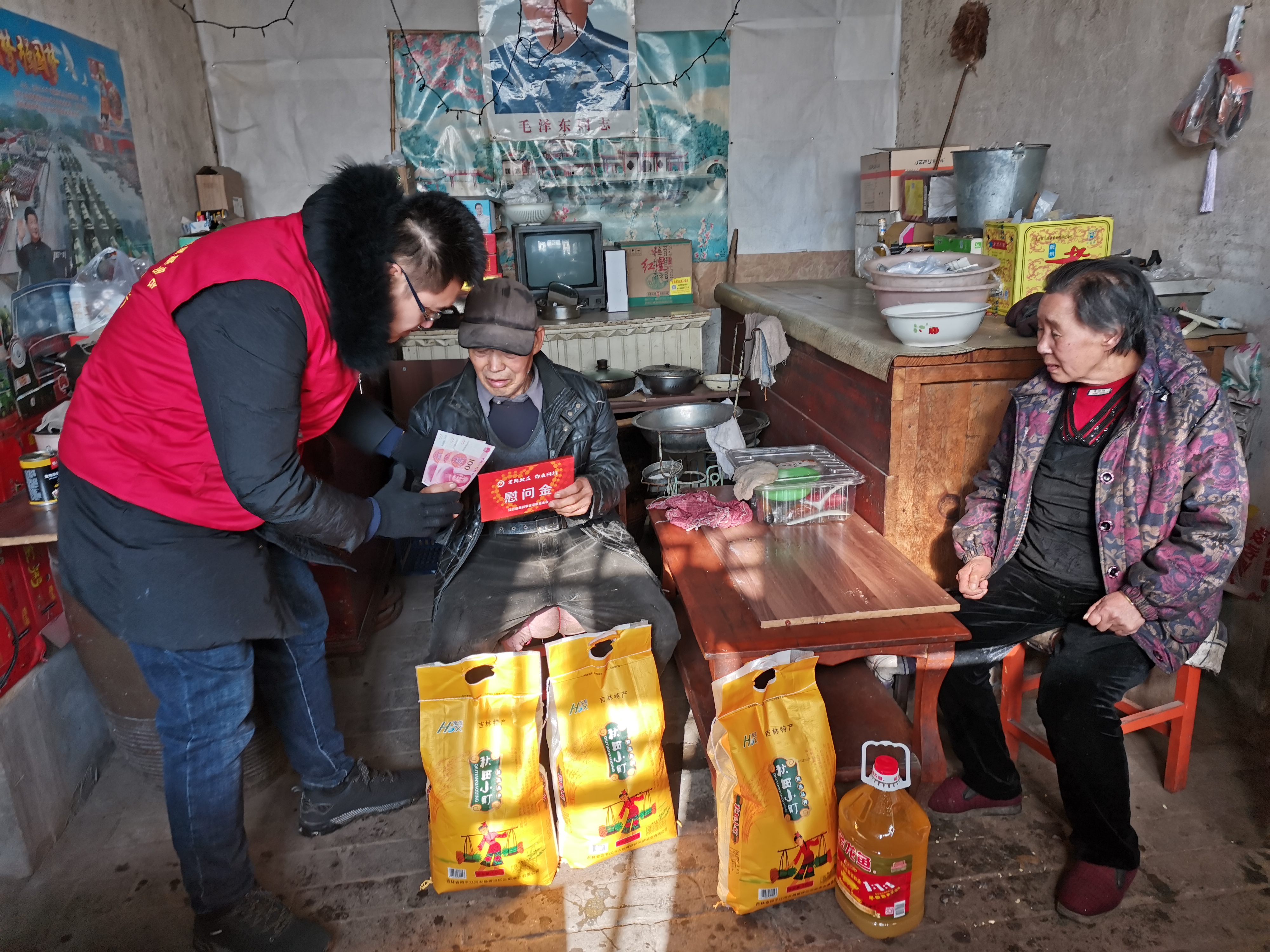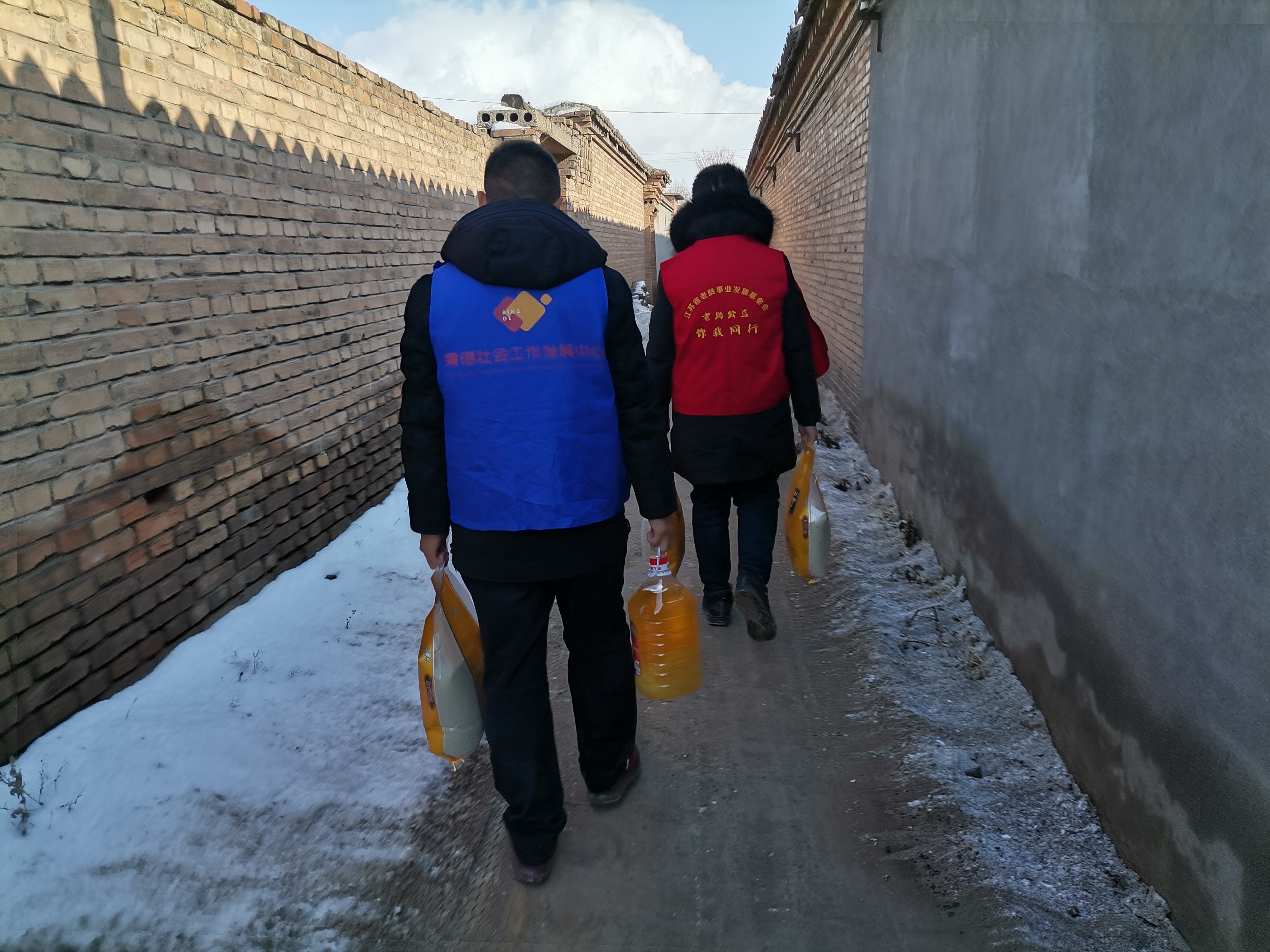 秉德社工总干事李军向领导和来宾汇报了本次活动的基本情况和“妇老乡亲”项目的开展情况。随后社工志愿者以入户慰问的方式看望了10户空巢老党员和残疾老人,为每户老人提供大米3袋(60斤)、食用油1桶、现金300元,总价6000元。希望通过这次活动为村里的空巢老人带来冬日的温暖。