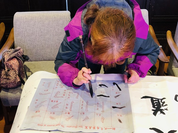 老师通过最基本的握笔、写字姿势开始手把手教大家进行书法练习,由最基本的横竖点捺撇开始。