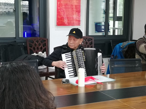 轻松的游戏过后叔叔阿姨们围坐在一起演奏手风琴经典曲目并相互交流演奏技巧。最后在亲民社工和黄阿姨的带领下,神采飞扬手风琴队的叔叔阿姨们讨论了如何更好地为居民们演出并提出了各种建议。