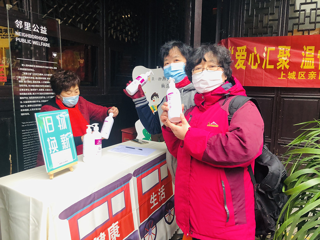 旧物换新摊位前,居民们用家中的废电池、空可乐瓶等可回收废弃物兑换免洗洗手液。
