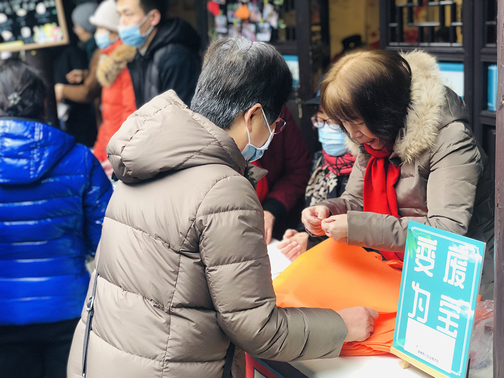 变废为宝摊位前,巧手志愿者们教大家利用无纺布自制垃圾袋。