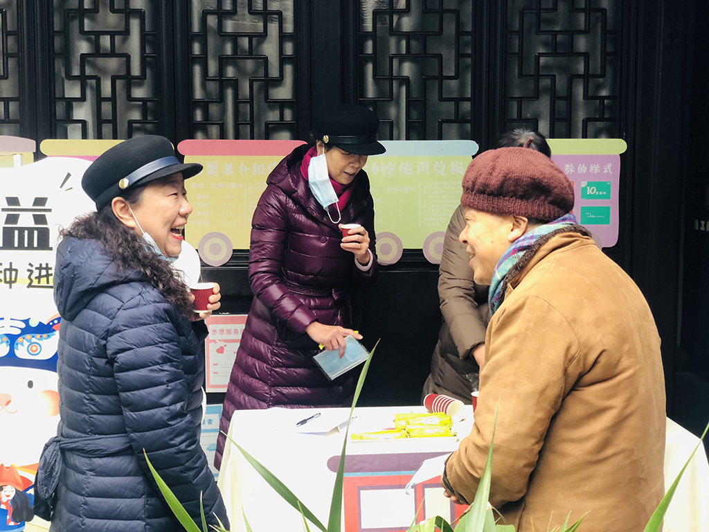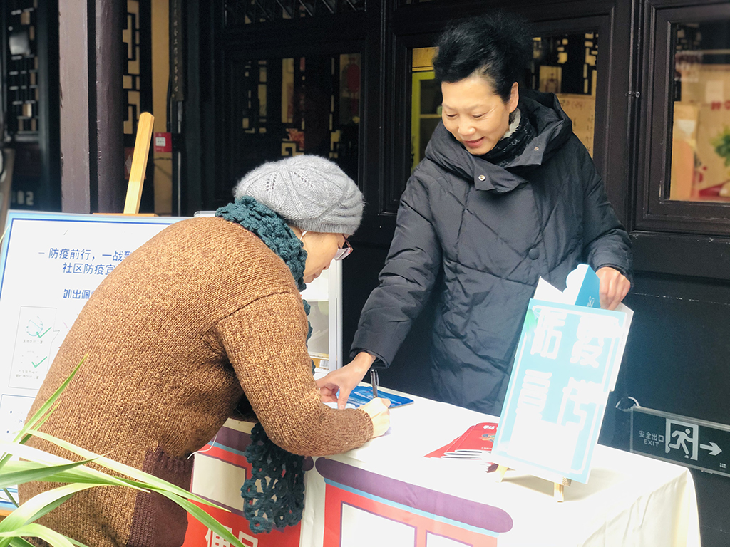 健康生活摊位上,志愿者们与现场居民进行防疫宣传的知识问答,分发健康常识宣传册。