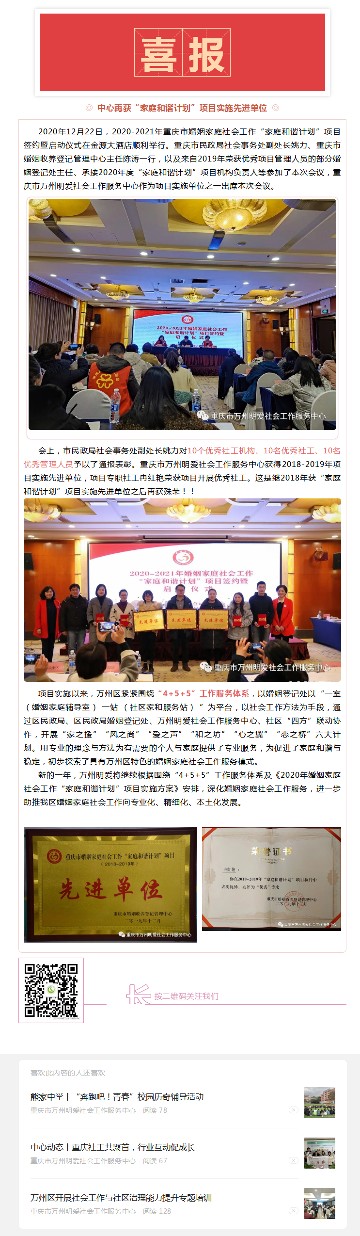 喜报:中心再获“家庭和谐计划”项目实施先进单位