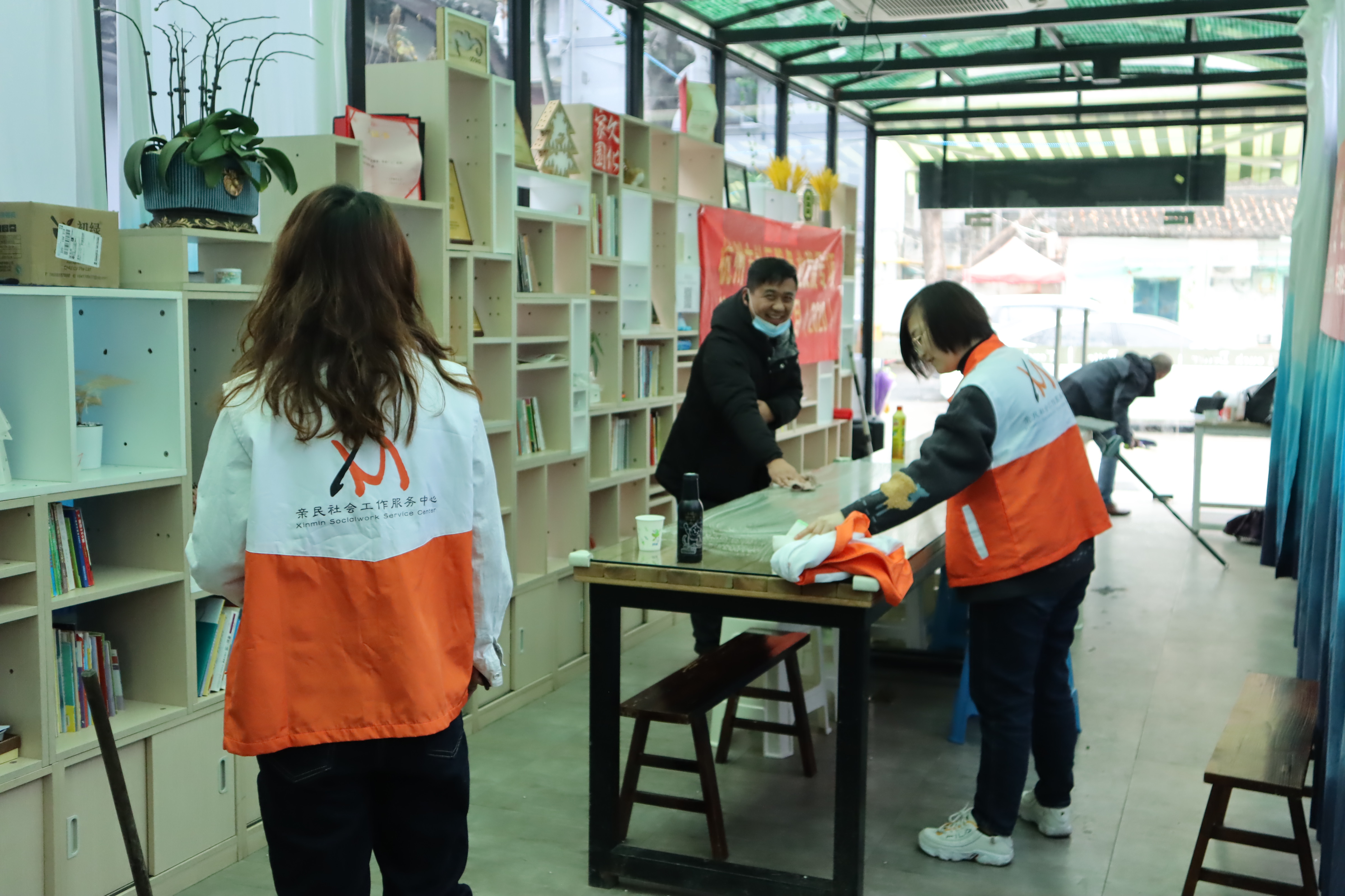 首先,大家自主推选出小组长,由组长从亲民社工手中抽取一张彩色纸签,每张纸签上都写了一项工作内容,以及该项工作所需的人数,然后小组长挑选各自的组员,组队完成,断舍离行动就热火朝天地开始了!大家按照事先的分组,领取工具,卖力地干起活来,“窗明”组上下刮擦玻璃,直到锃亮,“几净”组则将室内所有台面都抹得干干净净,“格局”组擦拭格子铺,将上面的书籍、摆件等重新整理归位,将一些多余的物品全部收到仓库里。大家说说笑笑,互帮互助,断舍离行动完,整个室内焕然一新,大家看着团队的劳动成果,感到满满的成就感。