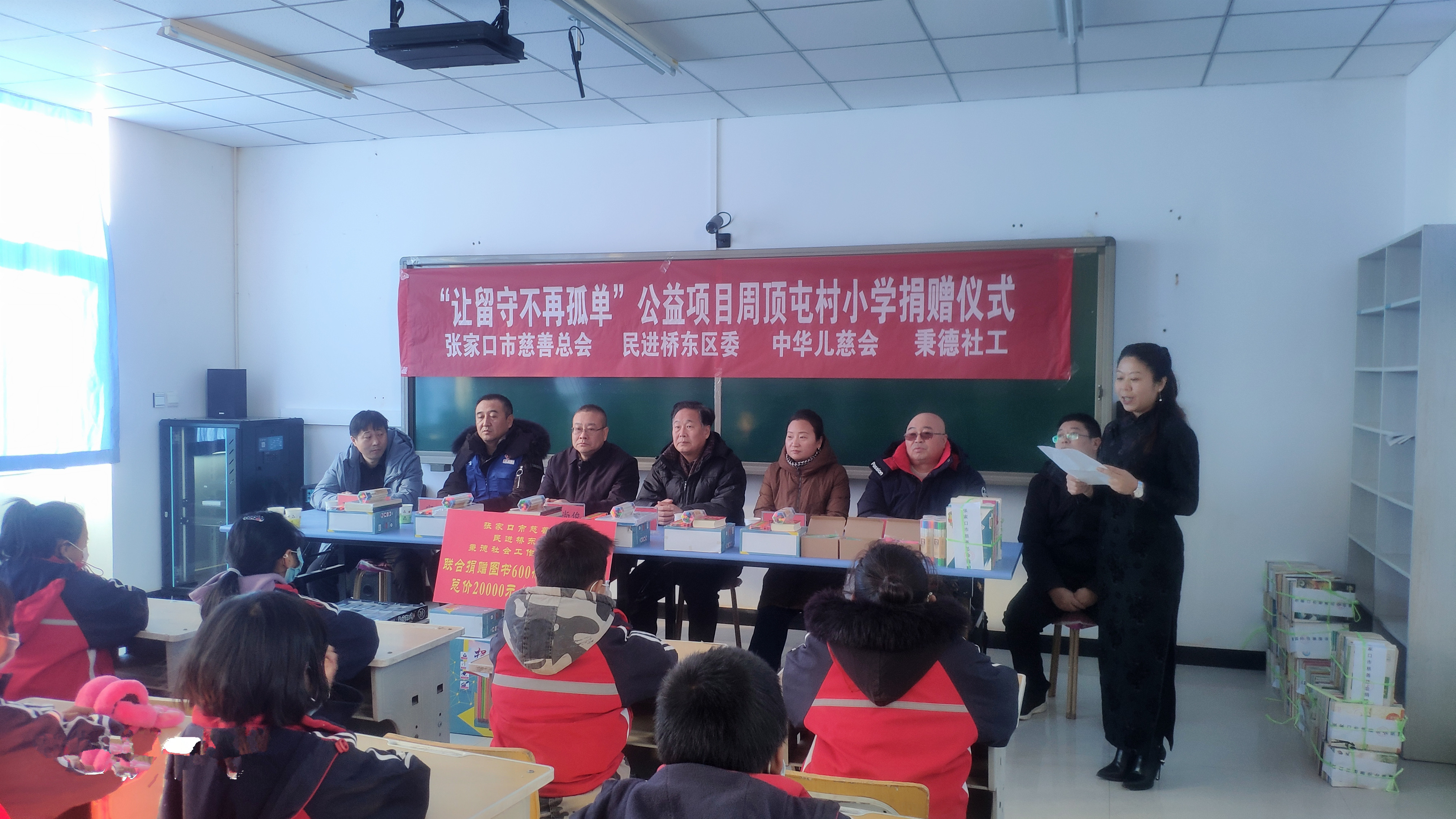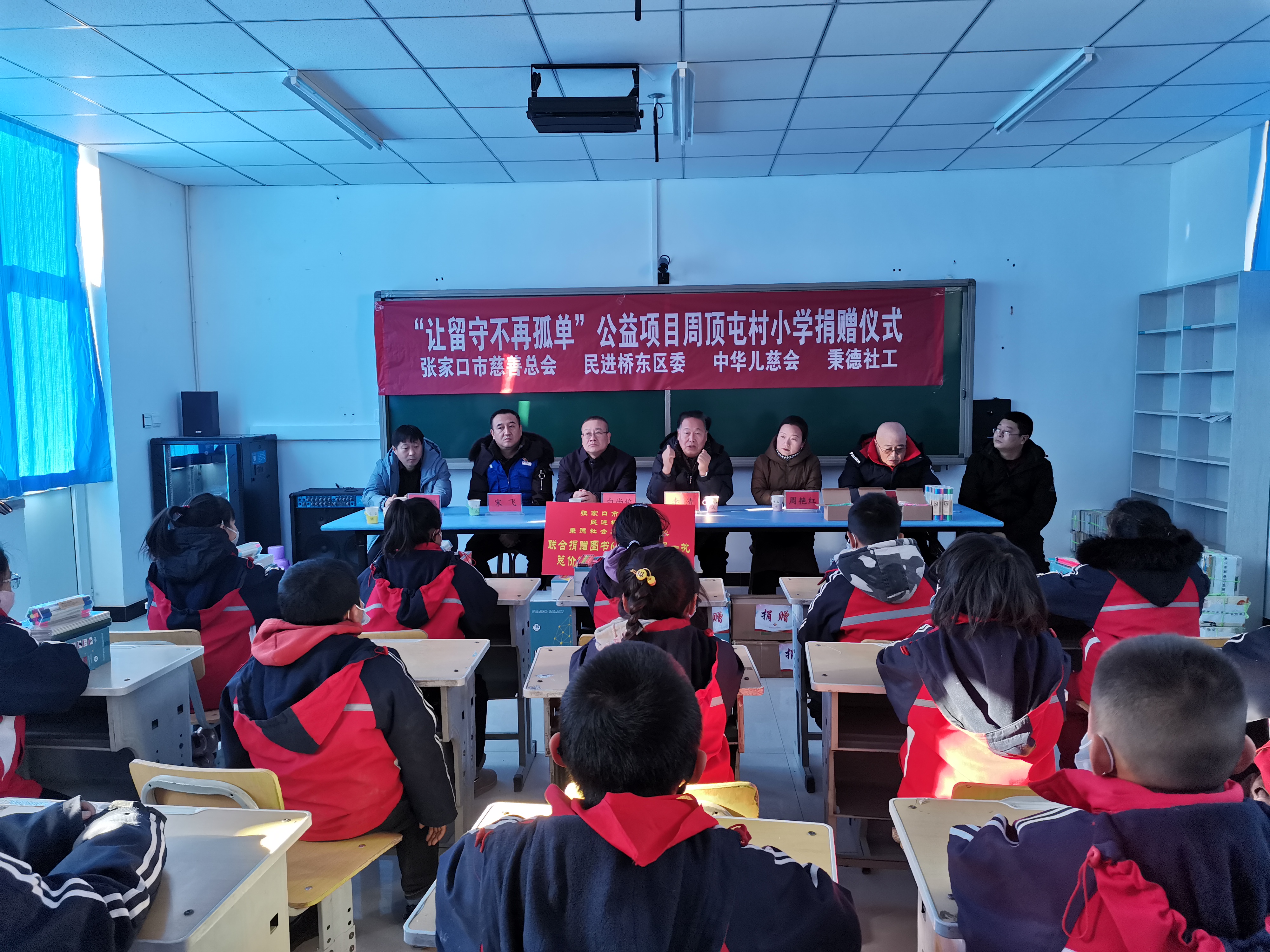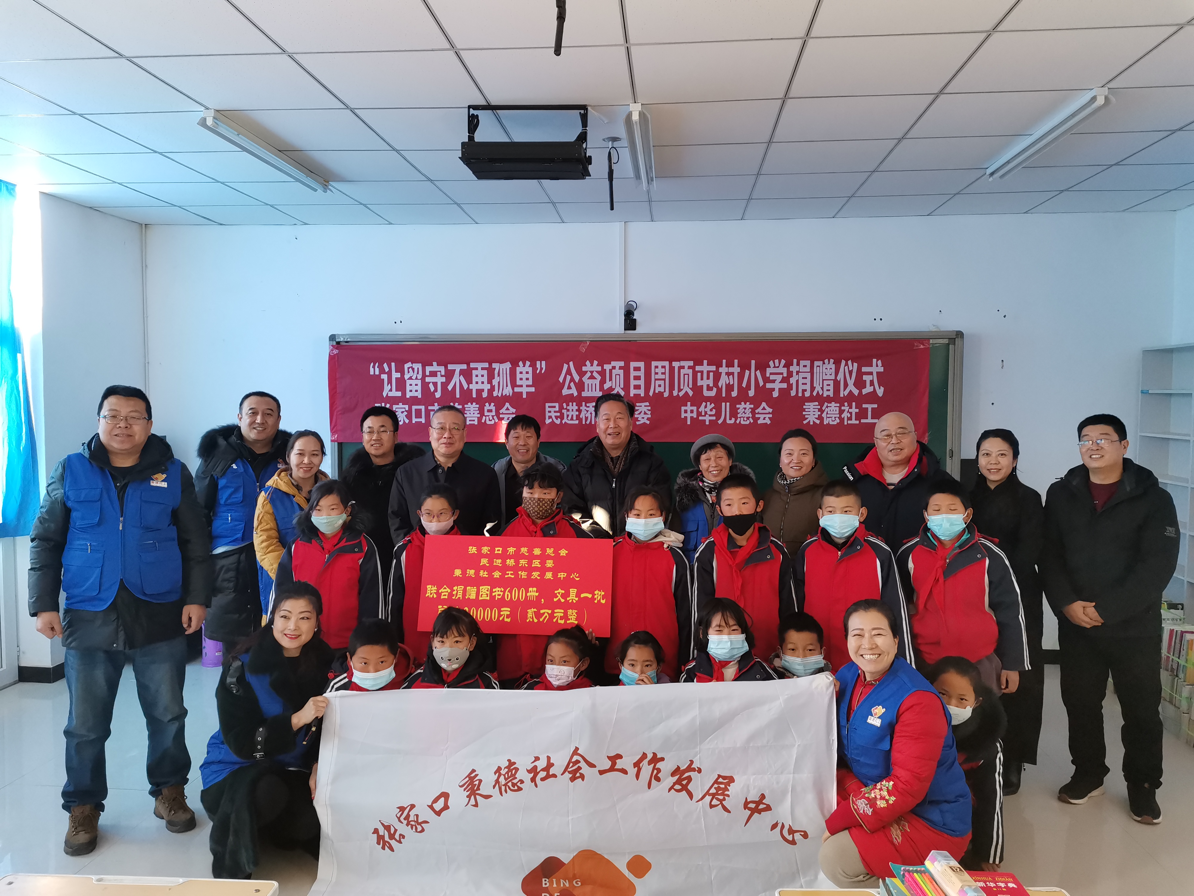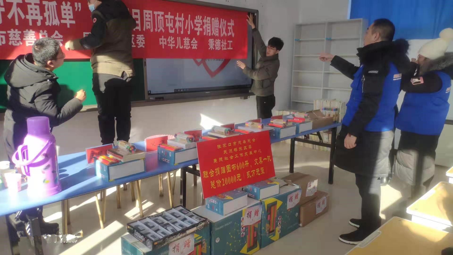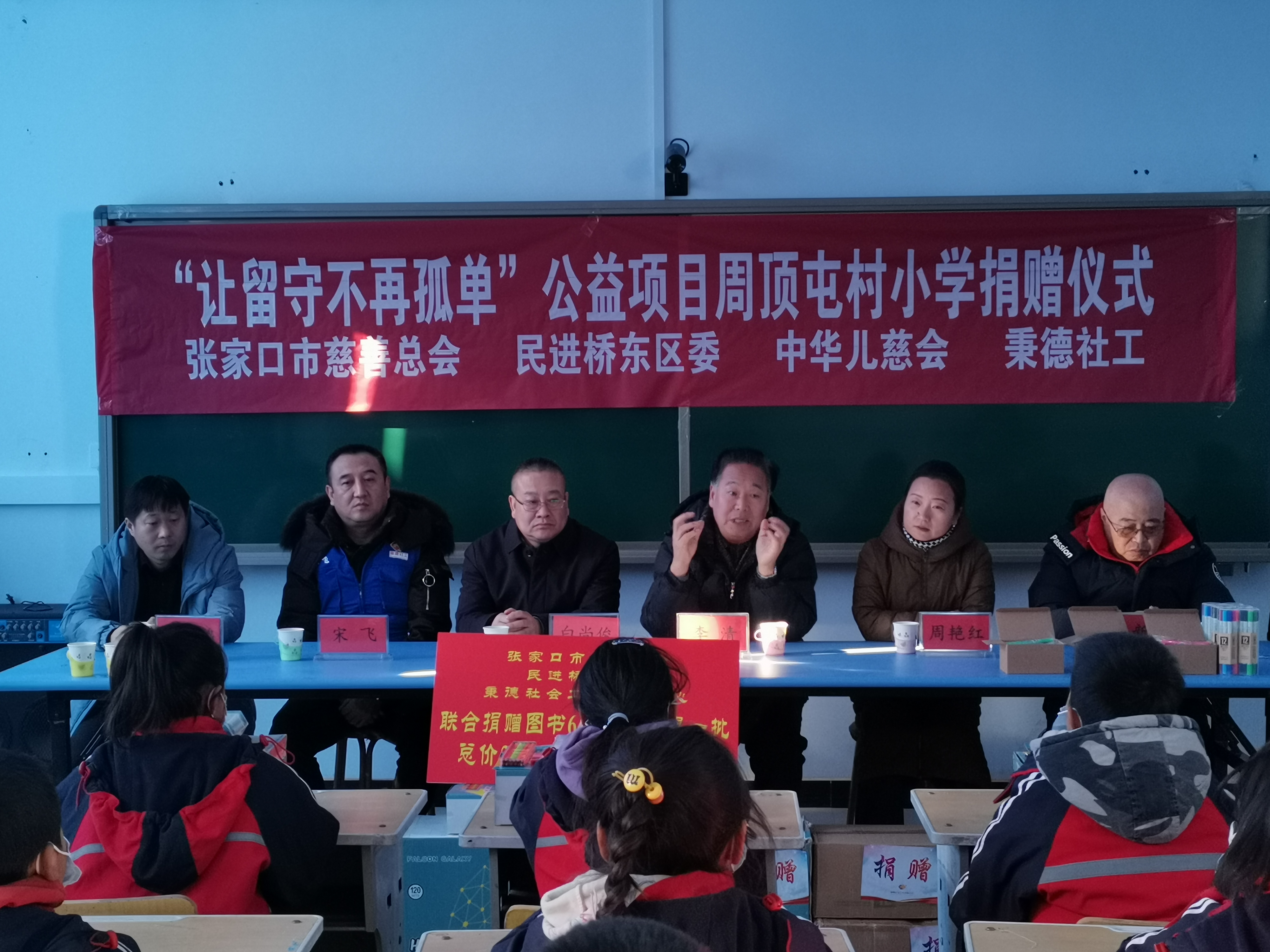 29日上午,本轮执行第4站大型捐赠活动在张家口市桥东区东望山乡周顶屯小学如期举行。出席本次捐赠活动的领导和嘉宾有张家口市慈善总会会长李清、副秘书长王崇新,桥东区统战部副部长周艳红,民进桥东区委主委白尚俊,东望山乡乡长王凤鹤,民进会员张运旅游总经理吴立曼,民进会员刘国峰、苏彦丽、荆福菊,周顶屯小学校长侯峰,秉德社工项目负责人宋飞、郝子桓,志愿者吕萍、赵世伟、张晓丽,王珊珊等,以及周顶屯学校师生出席捐赠仪式,吴立曼总经理主持捐赠仪式。
