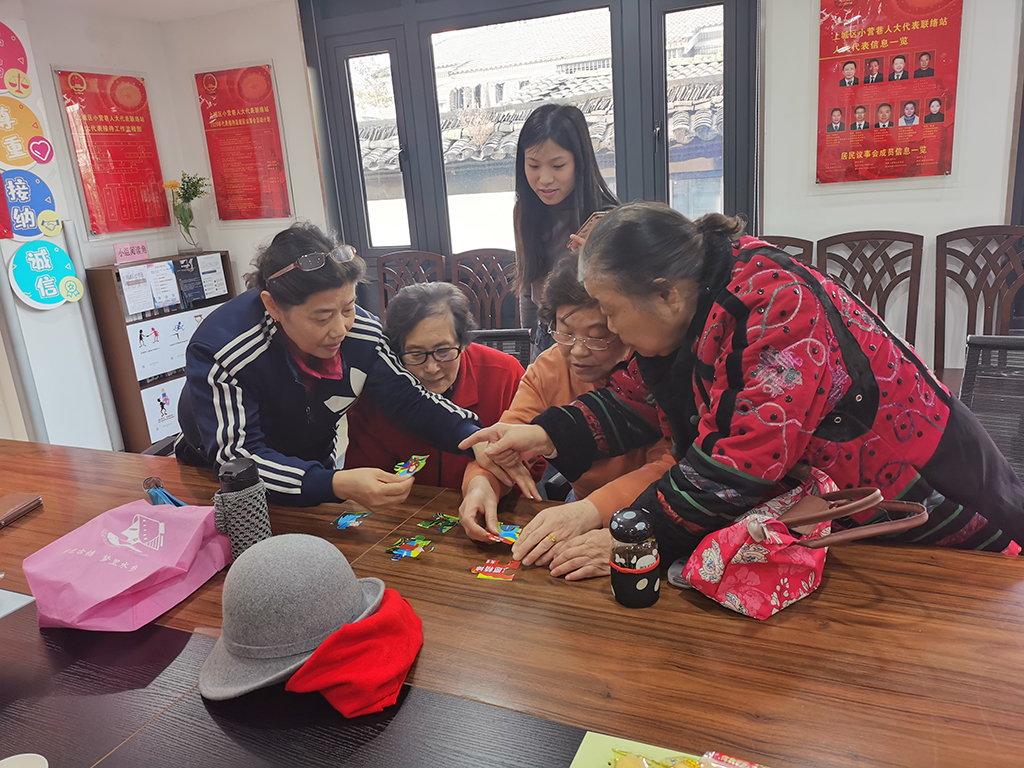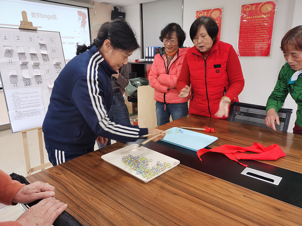 感触颇深的志愿分享活动后,数字BINGO战便拉开了。首先,亲民社工让志愿者们抽取新年福签,并通过不同的福签将大家分为“事事顺利红队”和“好运连连蓝队”。接着,获得石头剪刀布胜利的红队便先开始选择题板上的数字,每个数字后面有着对应的小游戏,完成挑战后即占领该格数字。小游戏内容丰富多样,有夹弹珠、听歌识曲、防疫知识问答、限时拼图、乒乓运球等等,阿姨们兴致高涨,玩得不亦乐乎。
