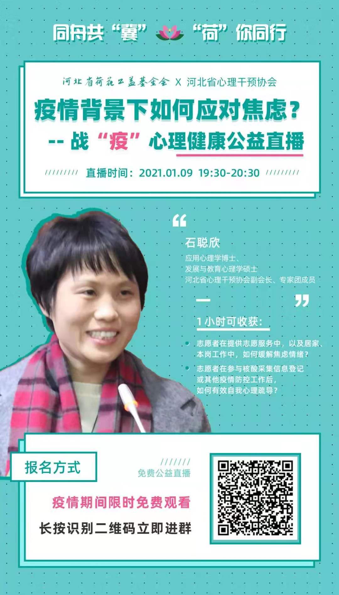 1月9日,荷花基金会与省心理干预协会联合开展《疫情背景下如何应对焦虑——战“疫”心理健康》公益直播,秉德社工6名骨干社工收看直播。本次直播邀请应用心理学博士石聪欣老师主讲,石老师主要讲疫情形式下焦虑的调节,这为我们社工志愿者在抗“疫”过程的心理起了必要的支持。目前,秉德社工骨干志愿者严阵以待,一方面对项目点提供防疫的指导与帮助,另一方面14名社工志愿者报名参与社区防疫,随时准备投入更严峻的防疫服务。