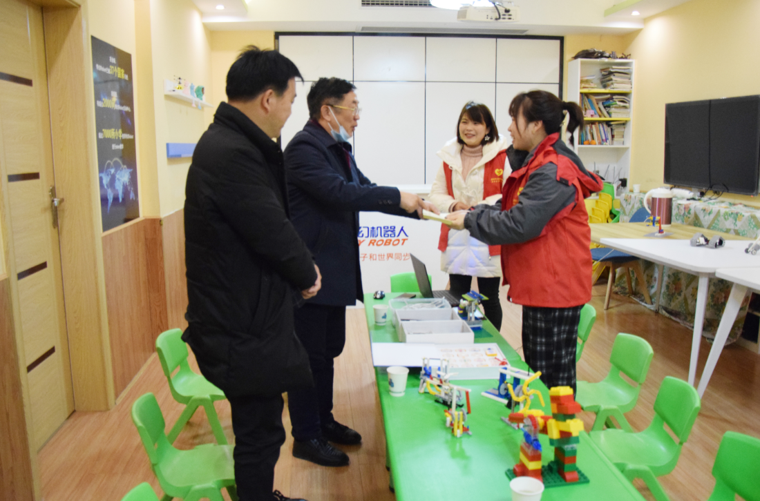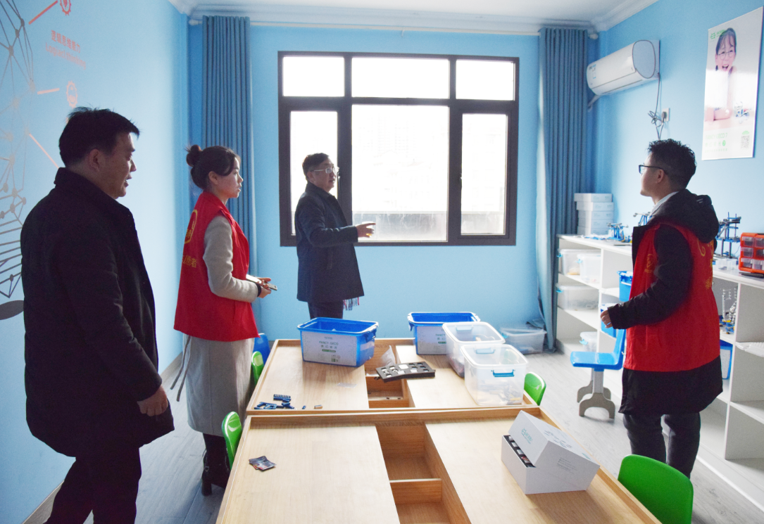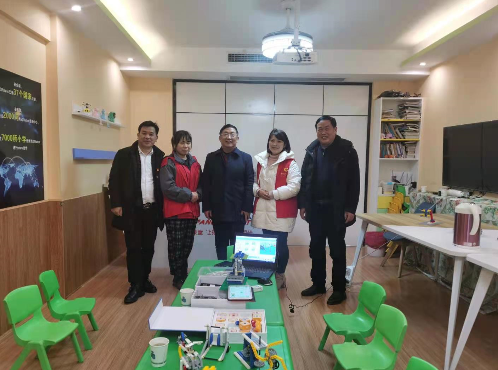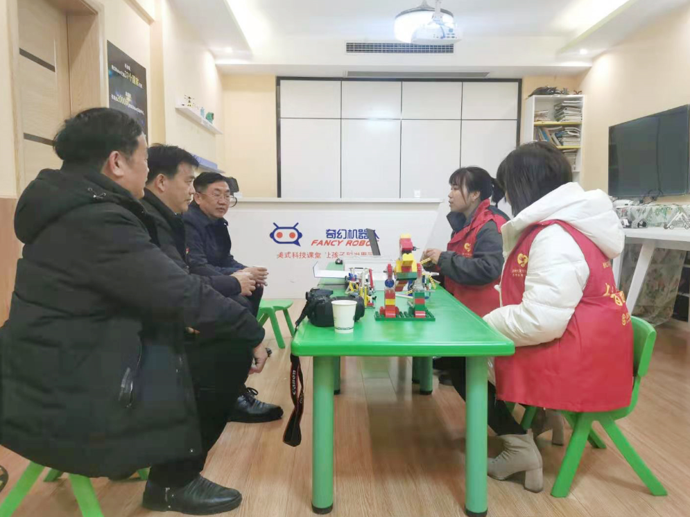 县科协党组书记、主席孟军一行参观小易文化&易道教育科技教室。科技志愿者为领导讲述科技课程的具体开展情况。
