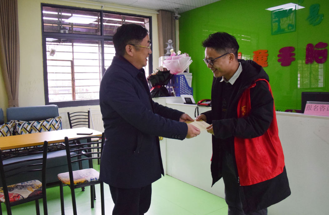 县科协党组书记、主席孟军一行为科技志愿者张红发放慰问金。