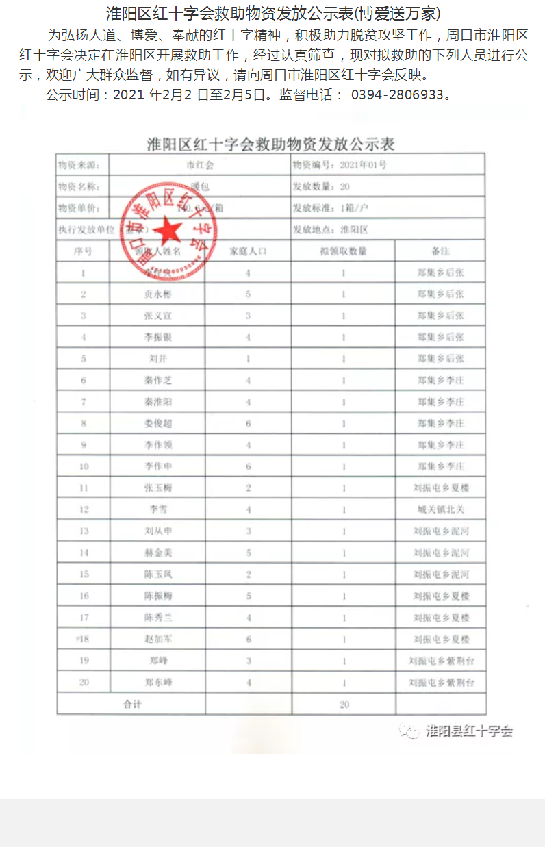 淮阳区红十字会救助物资发放公示表(博爱送万家)