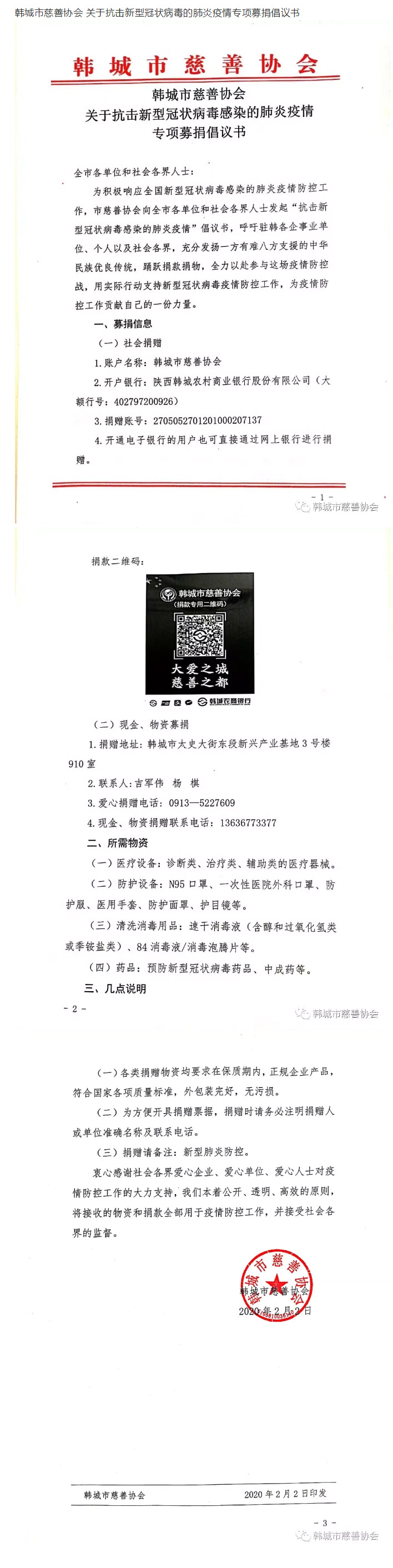 韩城市慈善协会 关于抗击新型冠状病毒的肺炎疫情专项募捐倡议书