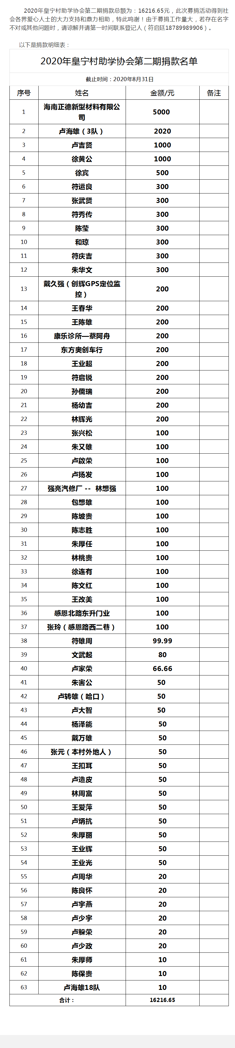 2020年皇宁村助学协会第二期捐款名单