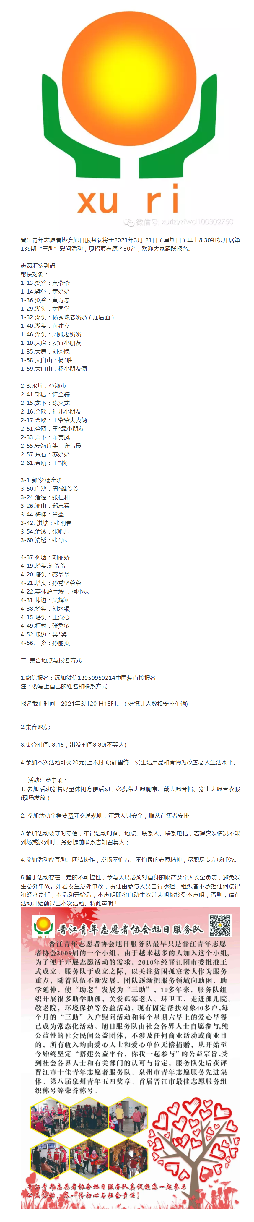 晋江青年志愿者协会旭日服务队将于2021年3月21日(星期日)早上8:30组织开展第139期“三助”慰问活动。
