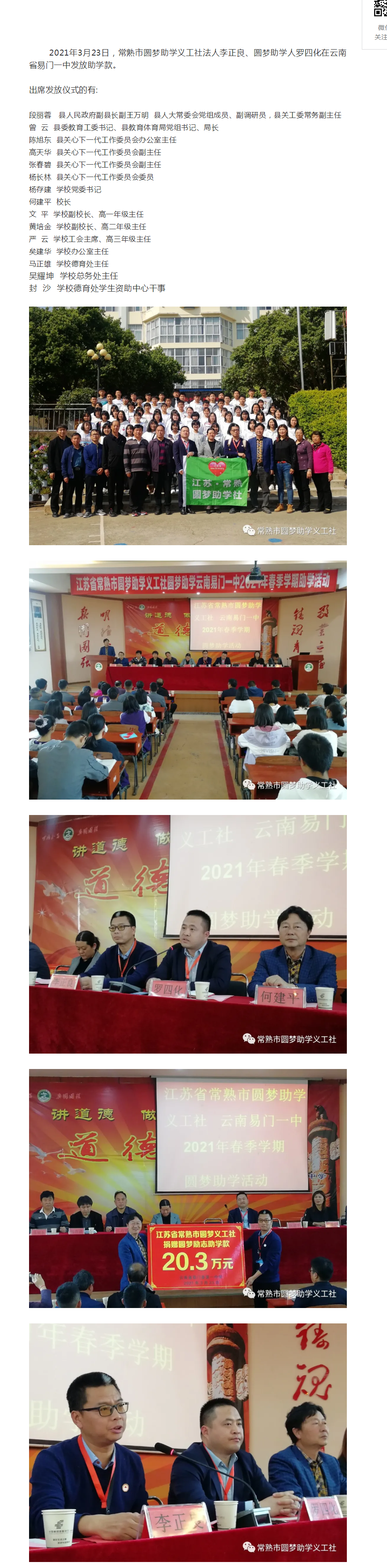 3月23日,常熟市圆梦助学社在云南省易门一中发放助学款。