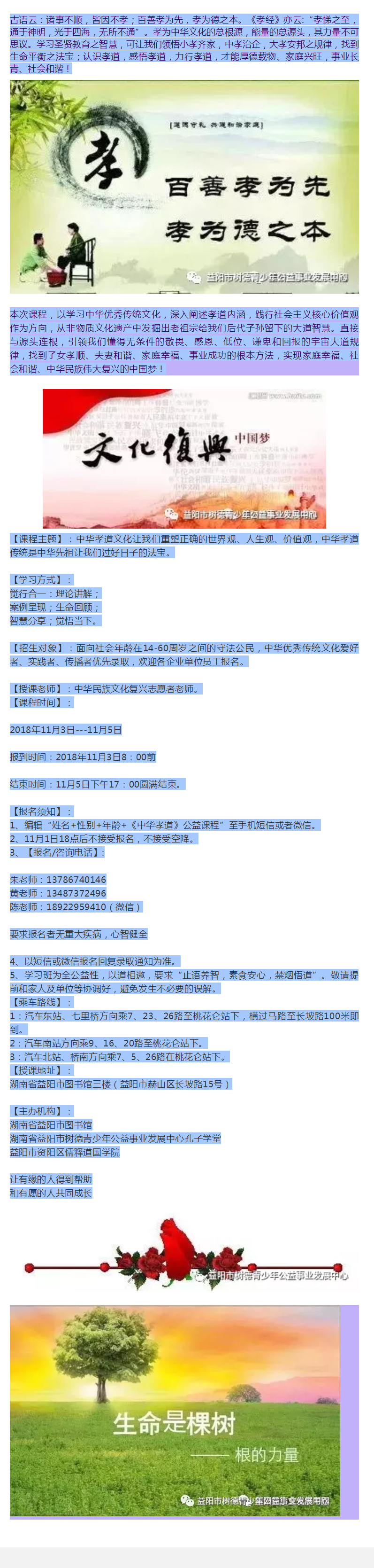 湖南益阳树德孔子学堂2018年11月3-5日《中华孝道》初级班公益课程