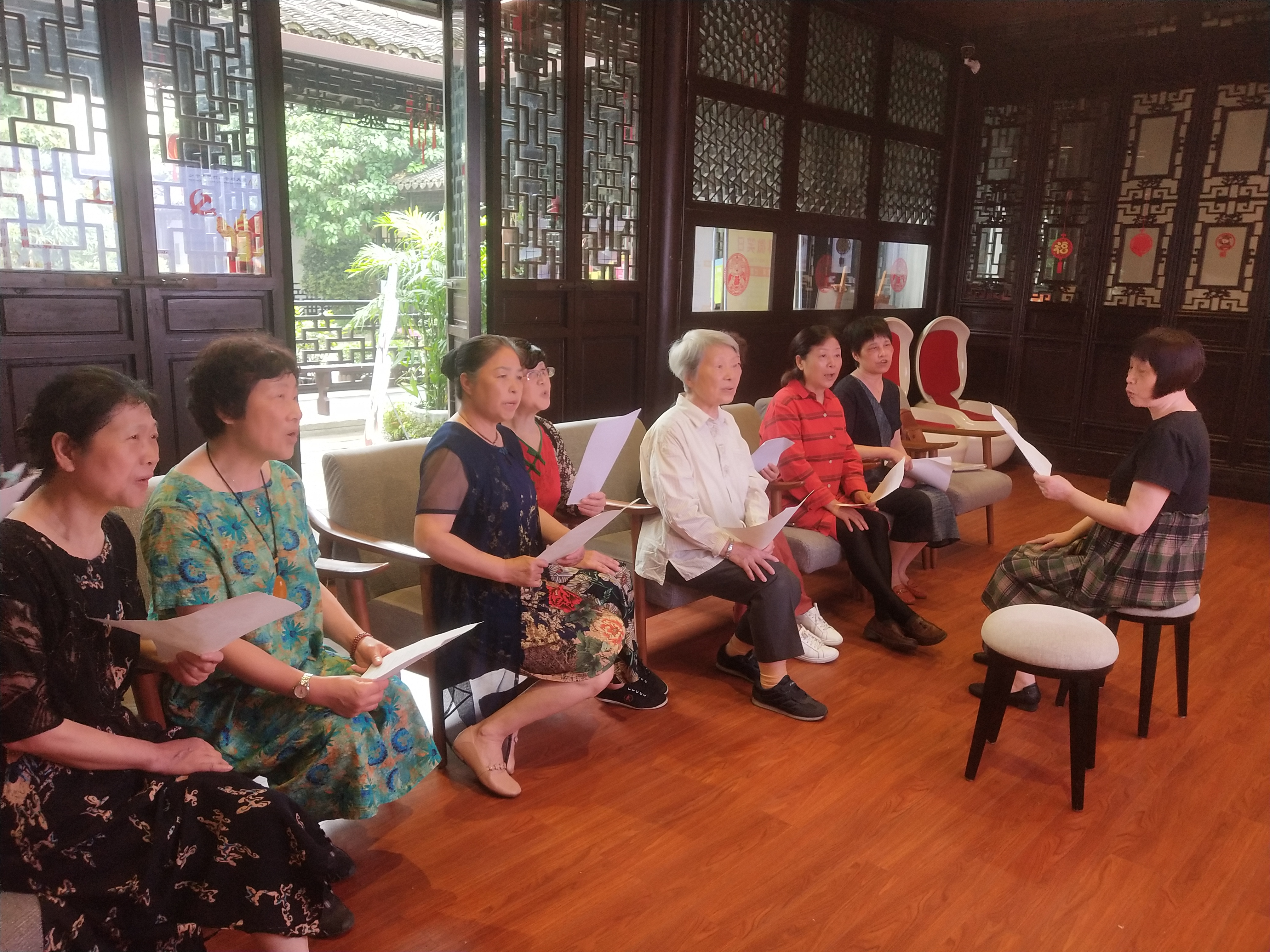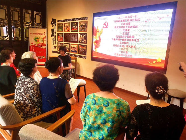 “一九二一年七月一日,当南湖那艘红船悄然起航,在涌动着”伴随着柔美的背景音乐,邻里公益传来了高亢激昂的朗诵声。这是社工带领亲民欢聚艺术团诗歌朗诵队在学习朗诵诗歌《中国的脊梁》。在社工的介绍下大家静静的赏析了这首诗歌:高度凝练的语言,生动形象地表达作者爱党爱国的丰富情感,具有鲜明的节奏,和谐的音韵,富于音乐美,节奏和韵律朗朗上口;诗歌的内容上具有高度的概括性、鲜明的形象性、浓烈的抒情性以及和谐的音乐性。通过诵读让大家产生了深深的共鸣,越读感情越充沛,大家的声音也从一开始的小声越念越大,吸引了前来游玩的居民们驻足观看。