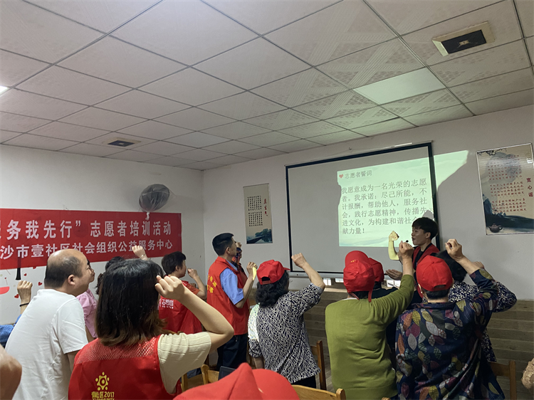 “我愿意成为一名光荣的志愿者,我承诺:尽己所能,不计报酬,帮助他人,服务社会!”,活动中社工还组织志愿者进行了志愿服务宣誓,整个宣誓现场气氛高涨、激荡人心。“志愿活动是一个帮助别人、提升自己、服务社会的过程。”志愿者孙爷爷谈到,在活动的最后社工引导参与志愿者分享了活动的感想以及自己的志愿经历,并动员志愿者们将此次培训学到的知识宣传到亲朋好友、左邻右舍的心中,让志愿精神走进千家万户。