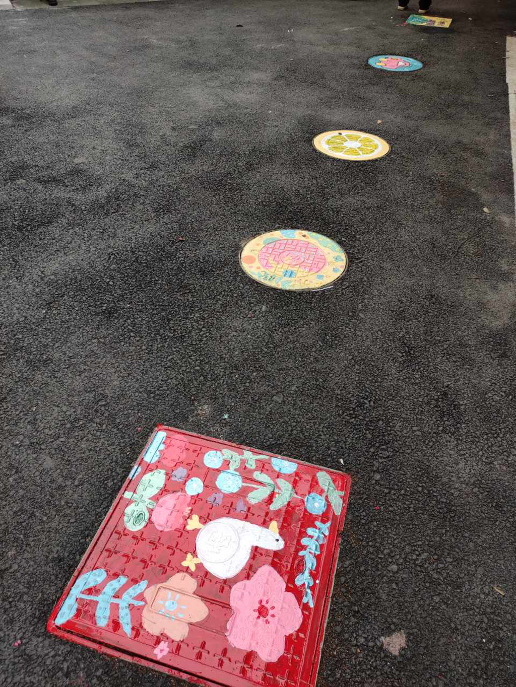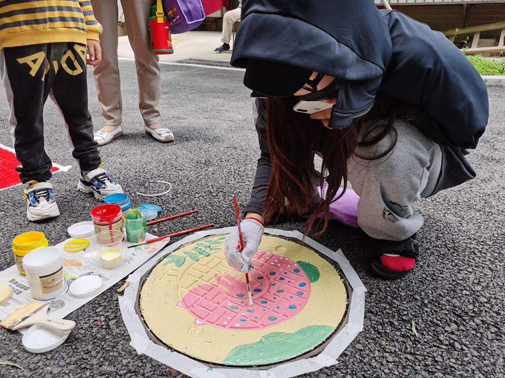 此次行动中共对塘河新村的三块区域进行了美化打造,它们分别是:井盖彩绘区、儿童游乐区和党建景观区。在井盖彩绘区,志愿者们和居民发挥创艺为塘河新村社区“井”上添花,一幅幅可爱别致的图案被绘制在原本普通的井盖上,用色彩点亮了社区中的一条平凡的林荫小路,也吸引了许多居民的驻足观赏。